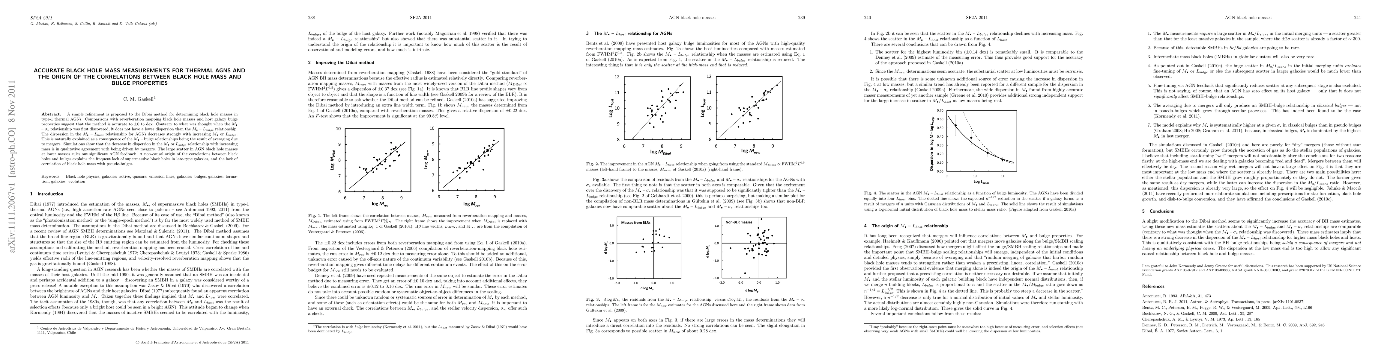 A simple refinement is proposed to the Dibai method for determining black hole masses in type-1 thermal AGNs. Comparisons with reverberation mapping black hole masses and host galaxy bulge properties suggest that the method is accurate to +/- 0.15 dex. Contrary to what was thought when the black hole mass - stellar velocity dispersion ("M - sigma") relationship was first discovered, it does not have a lower dispersion than the black hole mass - bulge luminosity ("M - L") relationship. The dispersion in the M - L relationship for AGNs decreases strongly with increasing black hole mass or bulge luminosity. This is naturally explained as a consequence of the black hole - bulge relationships being the result of averaging due to mergers. Simulations show that the decrease in dispersion in the M - L relationship with increasing mass is in qualitative agreement with being driven by mergers. The large scatter in AGN black hole masses at lower masses rules out significant AGN feedback. A non-causal origin of the correlations between black holes and bulges explains the frequent lack of supermassive black holes in late-type galaxies, and the lack of correlation of black hole mass with pseudo-bulges.