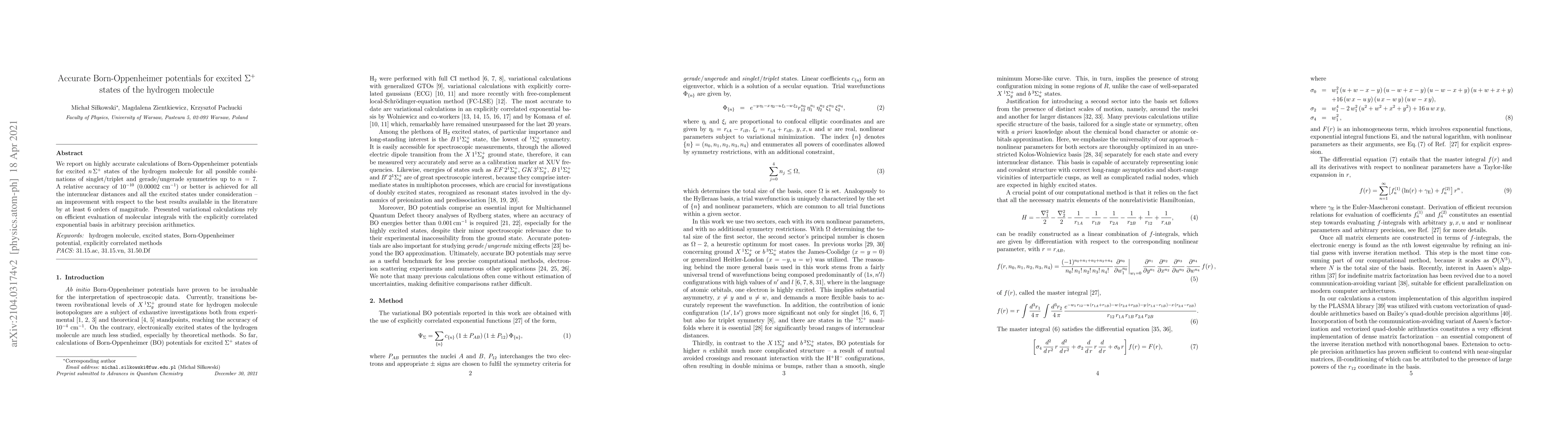 This paper presents highly accurate Born-Oppenheimer potentials for excited $n\,\Sigma^{+}$ states of the hydrogen molecule, achieving a relative accuracy of $10^{-10}$ or better. The calculations utilize variational methods and explicitly correlated exponential basis functions in arbitrary precision arithmetic, surpassing previous results by six orders of magnitude.