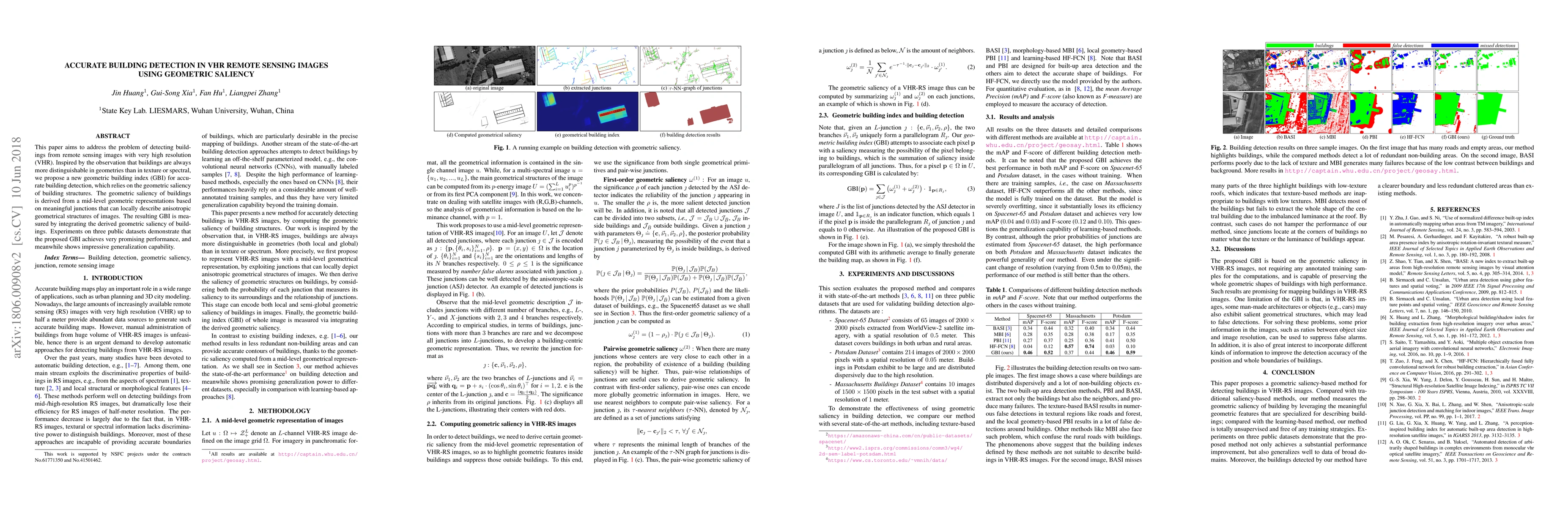 This paper proposes a new geometric building index (GBI) for accurate detection of buildings in very high-resolution remote sensing images, leveraging geometric saliency derived from meaningful junctions. Experiments show that the GBI achieves promising results and demonstrates strong generalization capability.