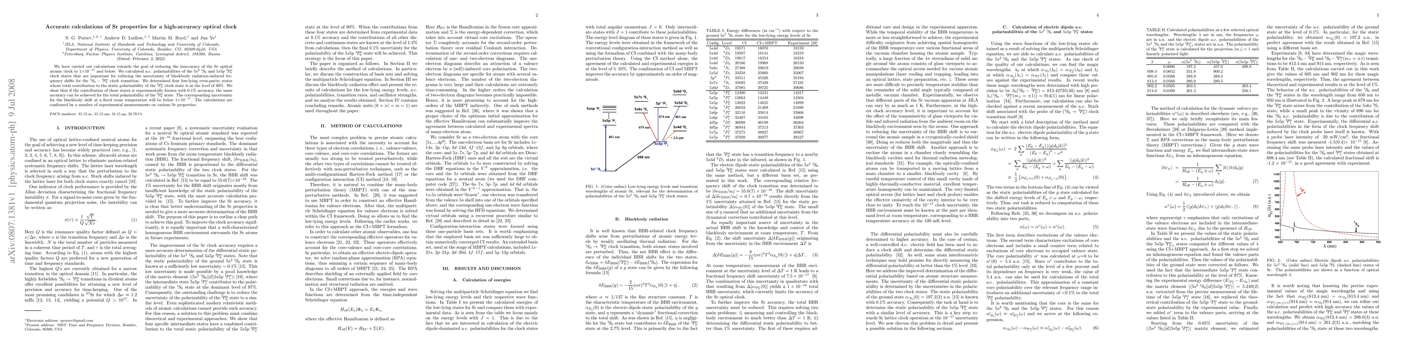 This paper reports calculations to reduce the inaccuracy of the Sr optical atomic clock to below 1×10^-17 by determining the a.c. polarizabilities of key clock states, achieving 90% contribution from four low-lying states, and confirming these with experimental measurements. The goal is to minimize blackbody radiation-induced frequency shifts.