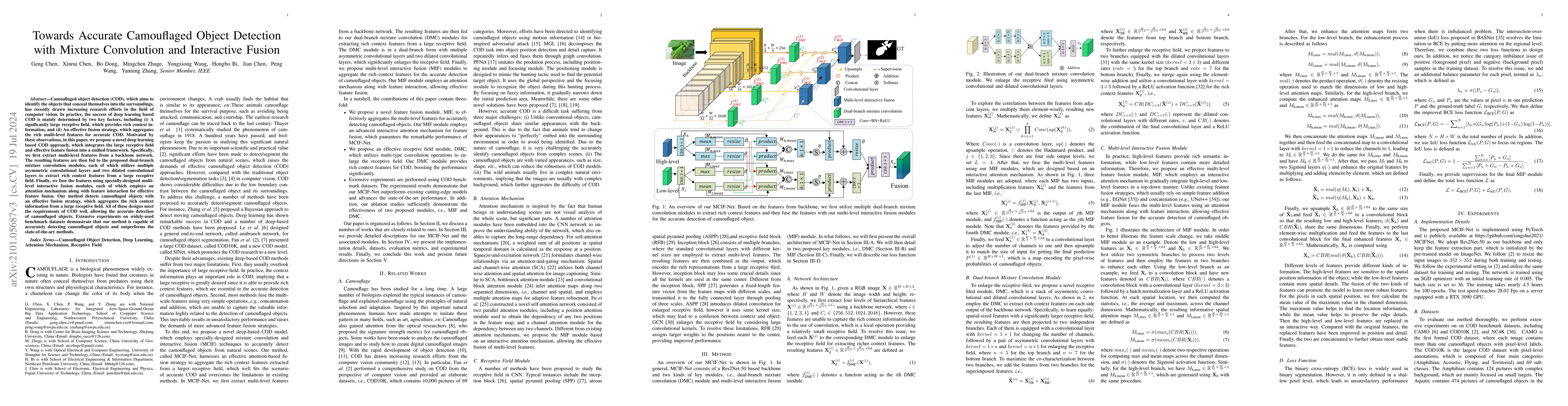 This paper proposes a novel deep learning approach for camouflaged object detection, integrating large receptive fields and effective feature fusion. It employs dual-branch mixture convolution modules and multi-level interactive fusion with attention mechanisms to enhance detection accuracy, outperforming state-of-the-art methods on benchmark datasets.