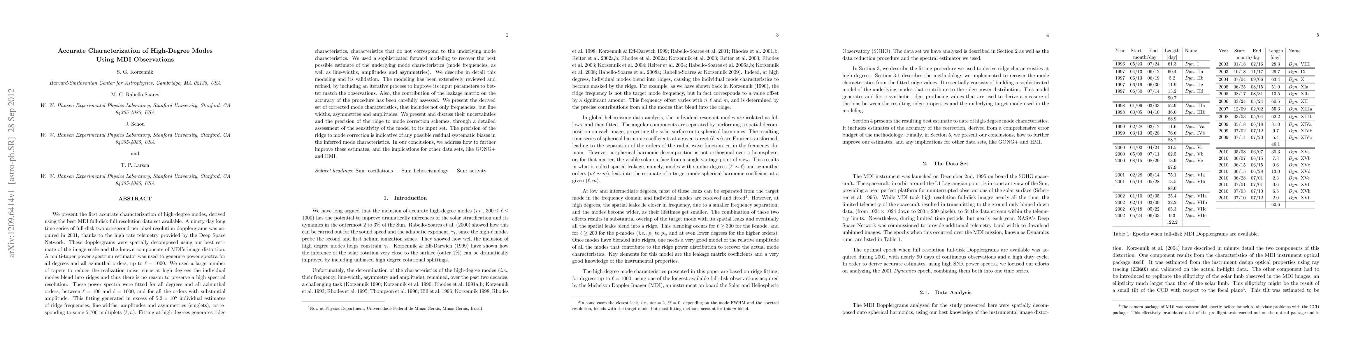 We present the first accurate characterization of high-degree modes, derived using the best MDI full-disk full-resolution data set available. A ninety day long time series of full-disk two arc-second per pixel resolution dopplergrams was acquired in 2001. These dopplergrams were spatially decomposed using our best estimate of the image scale and the known components of MDI's image distortion. A multi-taper power spectrum estimator was used to generate power spectra up to l = 1000, with a large number of tapers to reduce the realization noise, while the blending at high degrees negates the need for high spectral resolution. These power spectra were fitted for all degrees and all azimuthal orders, between l = 100 and l = 1000. This fitting generated in excess of 6x10^6 individual estimates of ridge frequencies, line-widths, amplitudes and asymmetries (singlets: l,n,m), corresponding to some 6,000 multiplets (l,n). Fitting at high degrees generates ridge characteristics, characteristics that do not correspond to the underlying mode characteristics. We used a sophisticated forward modeling to recover the best possible estimate of the underlying mode characteristics (mode frequencies, as well as line-widths, amplitudes and asymmetries). We describe in detail this modeling and its validation. The modeling has been extensively reviewed and refined, by including an iterative process to improve its input parameters to better match the observations. Also, the contribution of the leakage matrix on the accuracy of the procedure has been carefully assessed. We present the derived set of corrected mode characteristics, discuss their uncertainties and the precision of the ridge to mode correction schemes. In our conclusions, we address how to further improve these estimates, and the implications for other data sets, like GONG+ and HMI.