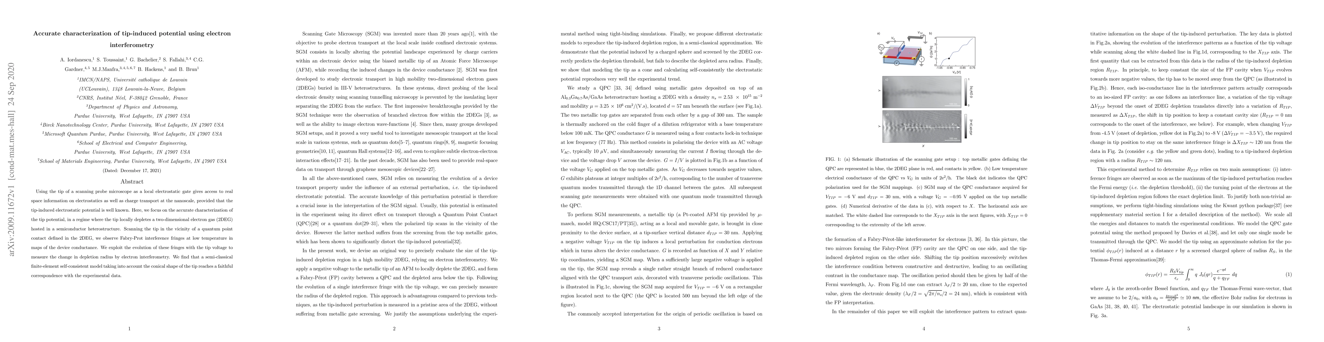 Using the tip of a scanning probe microscope as a local electrostatic gate gives access to real space information on electrostatics as well as charge transport at the nanoscale, provided that the tip-induced electrostatic potential is well known. Here, we focus on the accurate characterization of the tip potential, in a regime where the tip locally depletes a two-dimensional electron gas (2DEG) hosted in a semiconductor heterostructure. Scanning the tip in the vicinity of a quantum point contact defined in the 2DEG, we observe Fabry-P\'erot interference fringes at low temperature in maps of the device conductance. We exploit the evolution of these fringes with the tip voltage to measure the change in depletion radius by electron interferometry. We find that a semi-classical finite-element self-consistent model taking into account the conical shape of the tip reaches a faithful correspondence with the experimental data.