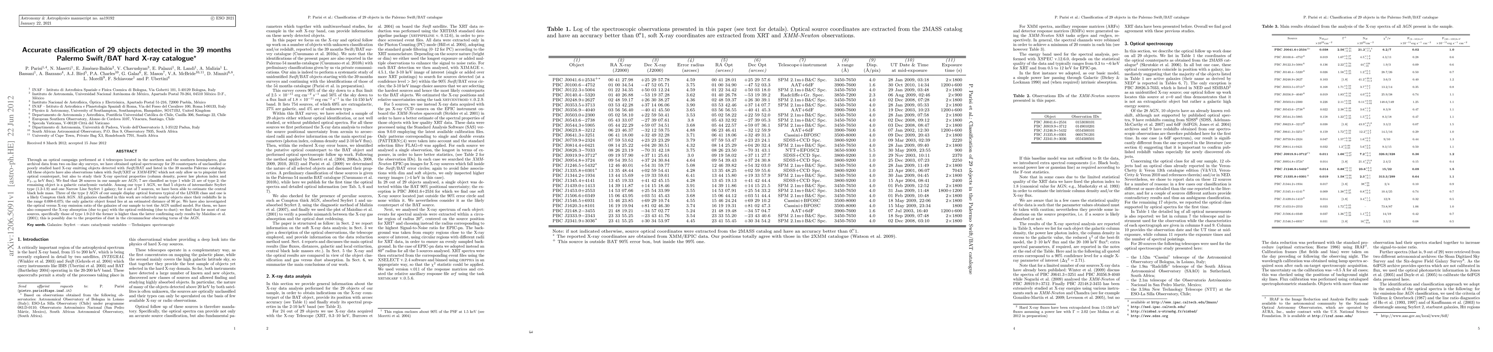 This study classifies 29 hard X-ray emitting objects from the Palermo Swift/BAT catalogue using optical spectroscopy and archival data. The majority (28) are classified as AGN, with 7 type 1 and 21 type 2, while one is a galactic cataclysmic variable. The research supports the AGN unified model and finds higher X-ray absorption than optical reddening in most sources.