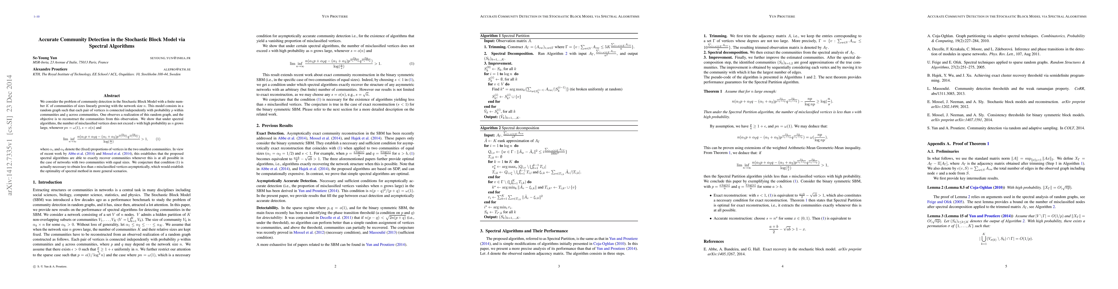 We consider the problem of community detection in the Stochastic Block Model with a finite number $K$ of communities of sizes linearly growing with the network size $n$. This model consists in a random graph such that each pair of vertices is connected independently with probability $p$ within communities and $q$ across communities. One observes a realization of this random graph, and the objective is to reconstruct the communities from this observation. We show that under spectral algorithms, the number of misclassified vertices does not exceed $s$ with high probability as $n$ grows large, whenever $pn=\omega(1)$, $s=o(n)$ and \begin{equation*} \lim\inf_{n\to\infty} {n(\alpha_1 p+\alpha_2 q-(\alpha_1 + \alpha_2)p^{\frac{\alpha_1}{\alpha_1 + \alpha_2}}q^{\frac{\alpha_2}{\alpha_1 + \alpha_2}})\over \log (\frac{n}{s})} >1,\quad\quad(1) \end{equation*} where $\alpha_1$ and $\alpha_2$ denote the (fixed) proportions of vertices in the two smallest communities. In view of recent work by Abbe et al. and Mossel et al., this establishes that the proposed spectral algorithms are able to exactly recover communities whenever this is at all possible in the case of networks with two communities with equal sizes. We conjecture that condition (1) is actually necessary to obtain less than $s$ misclassified vertices asymptotically, which would establish the optimality of spectral method in more general scenarios.