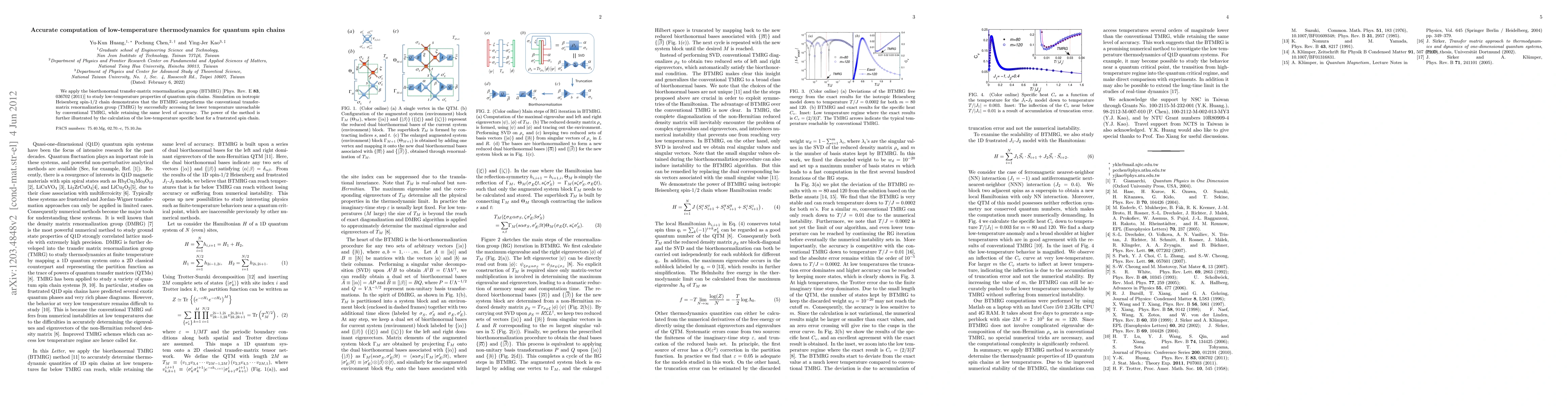 This paper employs the biorthonormal transfer-matrix renormalization group (BTMRG) to study low-temperature properties of quantum spin chains, showing it outperforms conventional TMRG by reaching much lower temperatures while maintaining accuracy, and successfully calculates the specific heat for a frustrated spin chain.