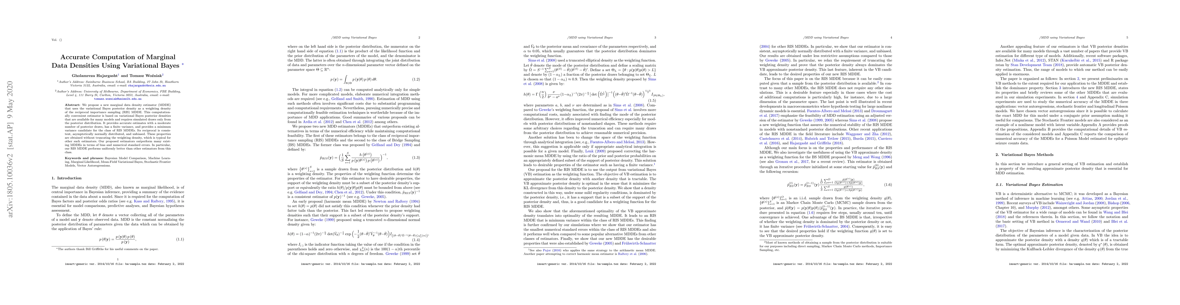 This paper introduces a new marginal data density estimator (MDDE) leveraging variational Bayes posterior densities in reciprocal importance sampling. The proposed method offers accurate estimates with minimal bias and lower numerical standard errors compared to existing methods, without the need for density truncation.