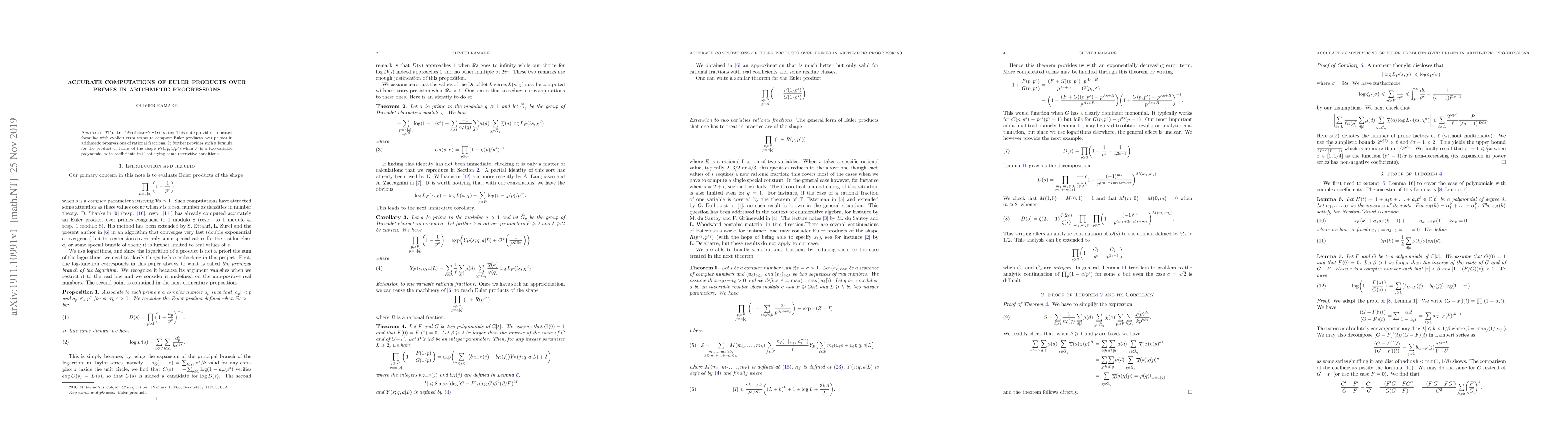 This paper presents truncated formulae with explicit error terms for computing Euler products over primes in arithmetic progressions, specifically for rational fractions and for products shaped by two-variable polynomials under certain conditions.