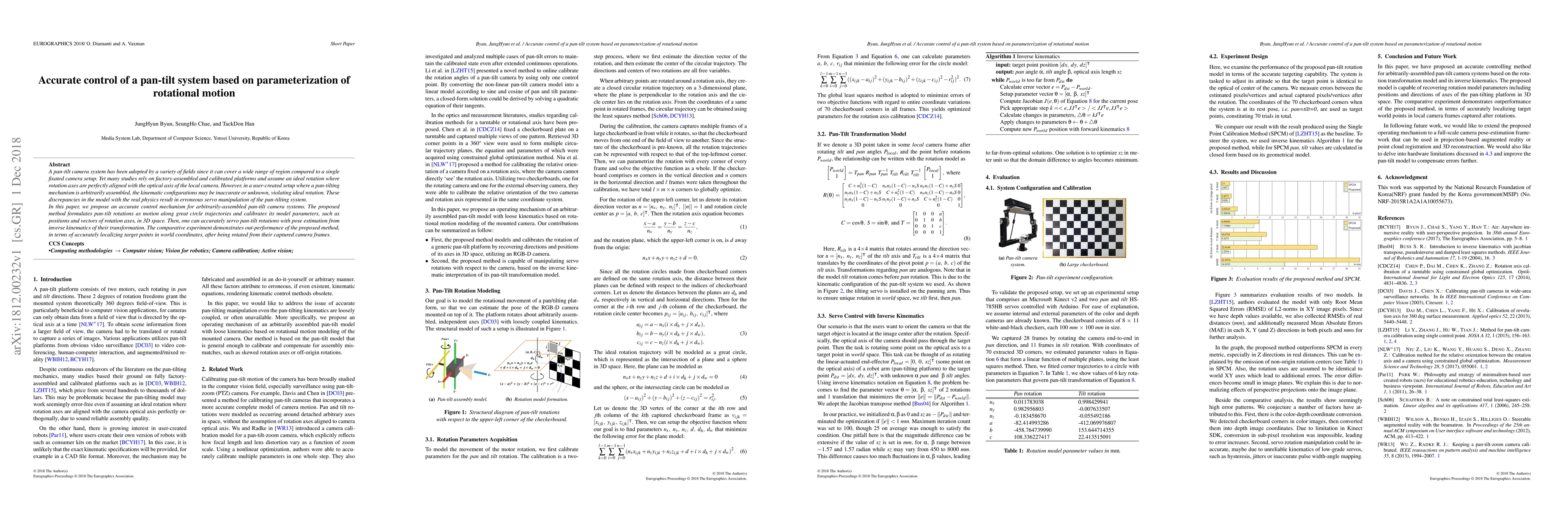 A pan-tilt camera system has been adopted by a variety of fields since it can cover a wide range of region compared to a single fixated camera setup. Yet many studies rely on factory-assembled and calibrated platforms and assume an ideal rotation where rotation axes are perfectly aligned with the optical axis of the local camera. However, in a user-created setup where a pan-tilting mechanism is arbitrarily assembled, the kinematic configurations may be inaccurate or unknown, violating ideal rotation. These discrepancies in the model with the real physics result in erroneous servo manipulation of the pan-tilting system. In this paper, we propose an accurate control mechanism for arbitrarily-assembled pan-tilt camera systems. The proposed method formulates pan-tilt rotations as motion along great circle trajectories and calibrates its model parameters, such as positions and vectors of rotation axes, in 3D space. Then, one can accurately servo pan-tilt rotations with pose estimation from inverse kinematics of their transformation. The comparative experiment demonstrates out-performance of the proposed method, in terms of accurately localizing target points in world coordinates, after being rotated from their captured camera frames.
