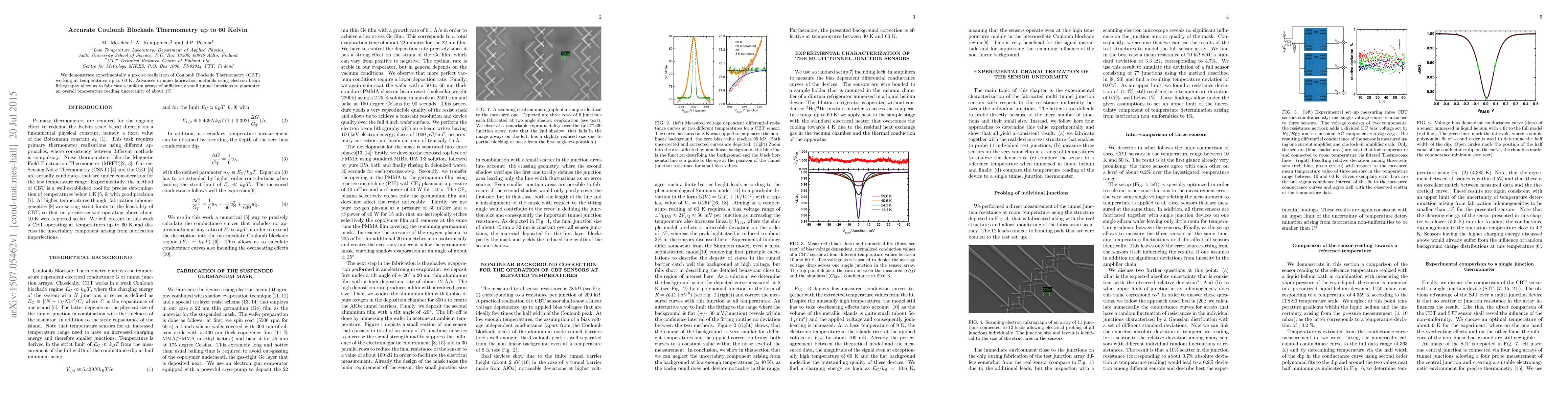 This research presents an experimentally validated method for precise Coulomb Blockade Thermometry (CBT) that operates reliably up to 60 K, achieved through advanced nanofabrication techniques, ensuring a temperature measurement uncertainty of approximately 1%.