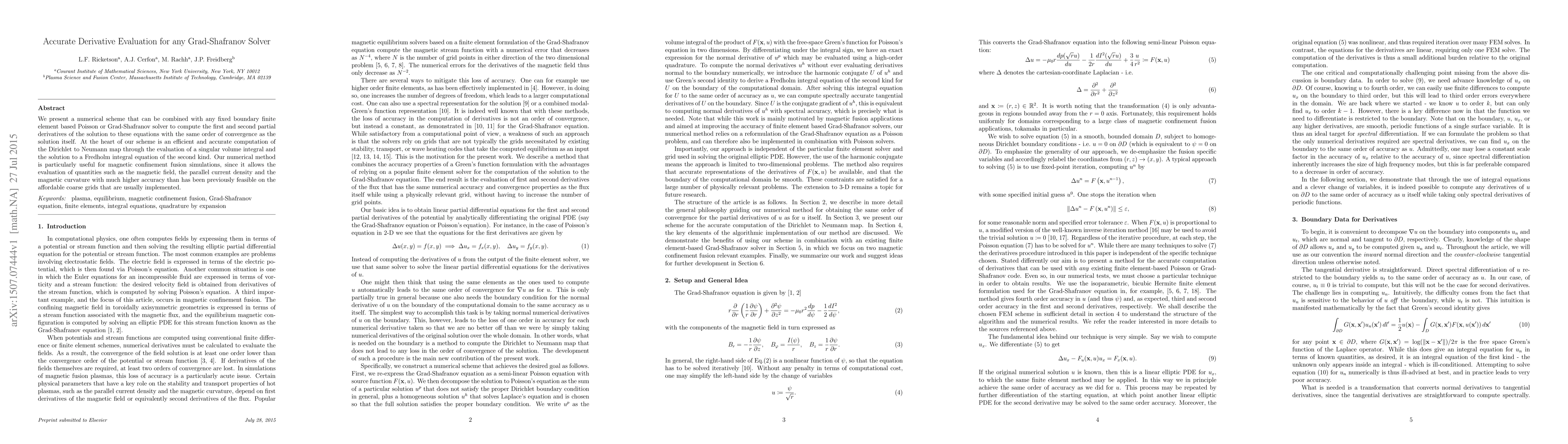 We present a numerical scheme that can be combined with any fixed boundary finite element based Poisson or Grad-Shafranov solver to compute the first and second partial derivatives of the solution to these equations with the same order of convergence as the solution itself. At the heart of our scheme is an efficient and accurate computation of the Dirichlet to Neumann map through the evaluation of a singular volume integral and the solution to a Fredholm integral equation of the second kind. Our numerical method is particularly useful for magnetic confinement fusion simulations, since it allows the evaluation of quantities such as the magnetic field, the parallel current density and the magnetic curvature with much higher accuracy than has been previously feasible on the affordable coarse grids that are usually implemented.