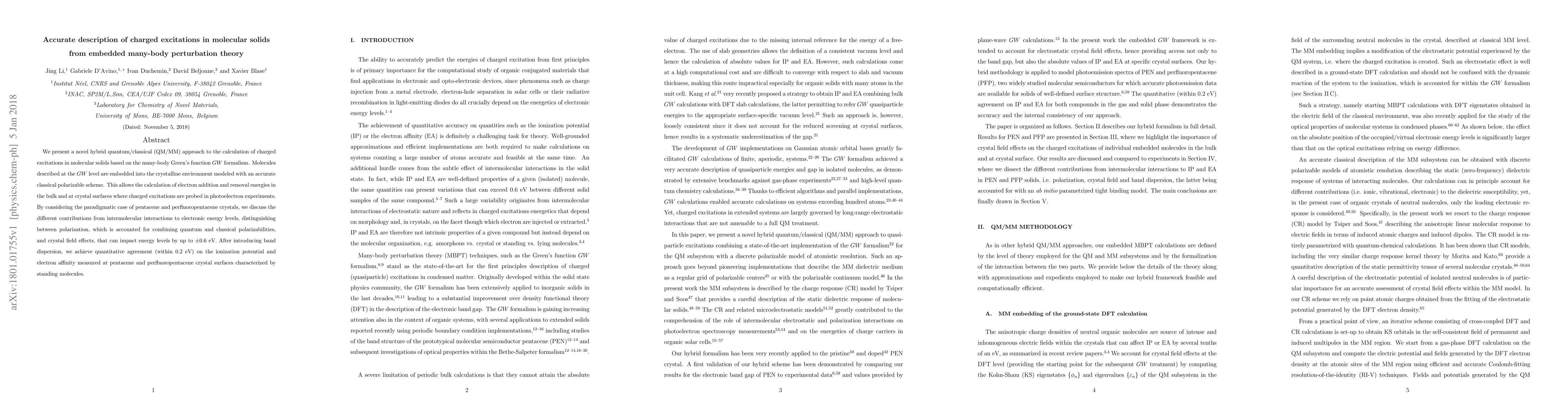 We present a novel hybrid quantum/classical (QM/MM) approach to the calculation of charged excitations in molecular solids based on the many-body Green's function $GW$ formalism. Molecules described at the $GW$ level are embedded into the crystalline environment modeled with an accurate classical polarizable scheme. This allows the calculation of electron addition and removal energies in the bulk and at crystal surfaces where charged excitations are probed in photoelectron experiments. By considering the paradigmatic case of pentacene and perfluoropentacene crystals, we discuss the different contributions from intermolecular interactions to electronic energy levels, distinguishing between polarization, which is accounted for combining quantum and classical polarizabilities, and crystal field effects, that can impact energy levels by up to $\pm0.6$ eV. After introducing band dispersion, we achieve quantitative agreement (within 0.2 eV) on the ionization potential and electron affinity measured at pentacene and perfluoropentacene crystal surfaces characterized by standing molecules.