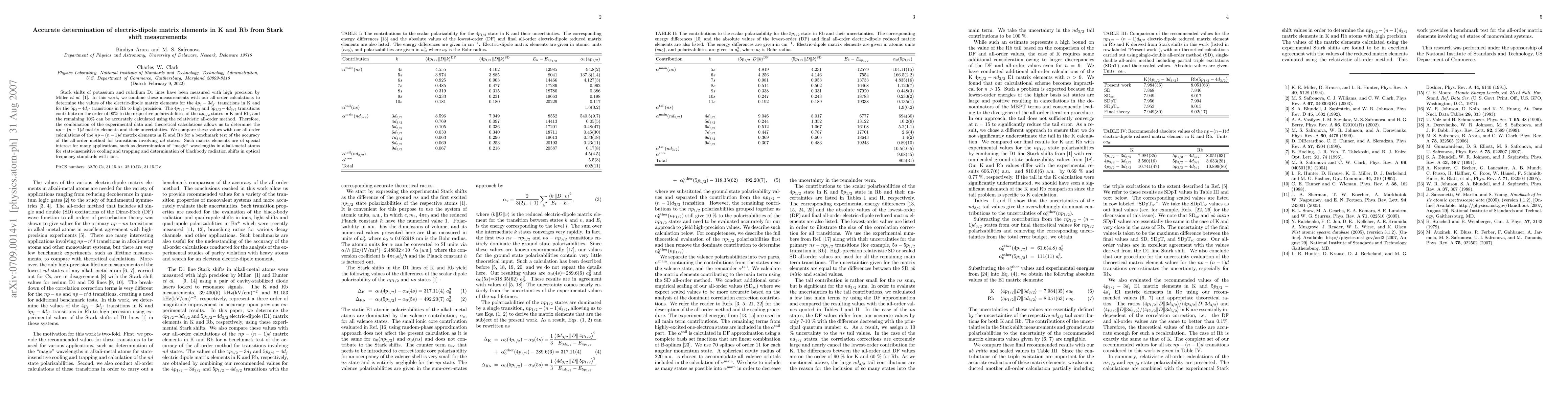 This paper combines high-precision Stark shift measurements of potassium and rubidium D1 lines with all-order calculations to accurately determine the electric-dipole matrix elements for specific transitions in K and Rb. The study benchmarks the accuracy of the all-order method for nd state transitions, which are crucial for applications like state-insensitive cooling and optical frequency standards.