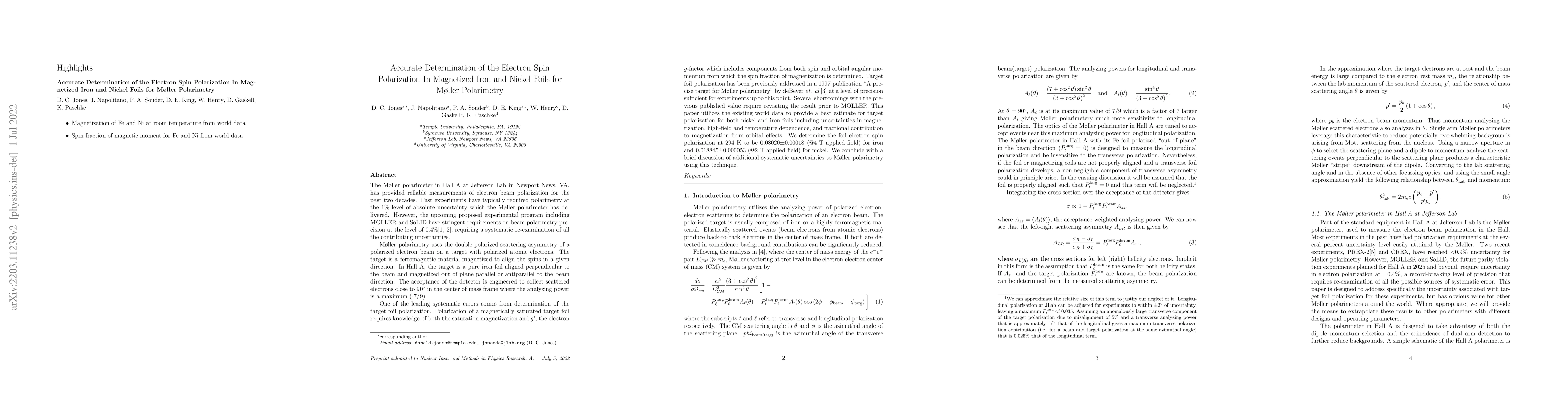 This paper determines the electron spin polarization in magnetized iron and nickel foils for M{\o}ller polarimetry, achieving a precision of 0.08020$\pm$0.00018 for iron and 0.018845$\pm$0.000053 for nickel, addressing systematic uncertainties in polarization measurement for future high-precision experiments.