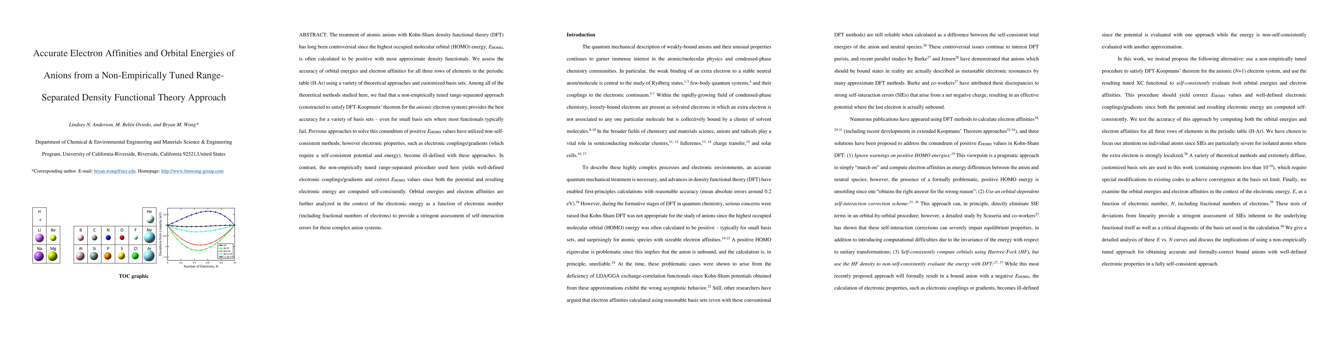This paper evaluates various theoretical approaches for accurately calculating orbital energies and electron affinities of atomic anions, finding that a non-empirically tuned range-separated density functional theory approach provides the best accuracy, even with small basis sets. This method yields well-defined electronic properties and corrects the issue of positive HOMO energies.