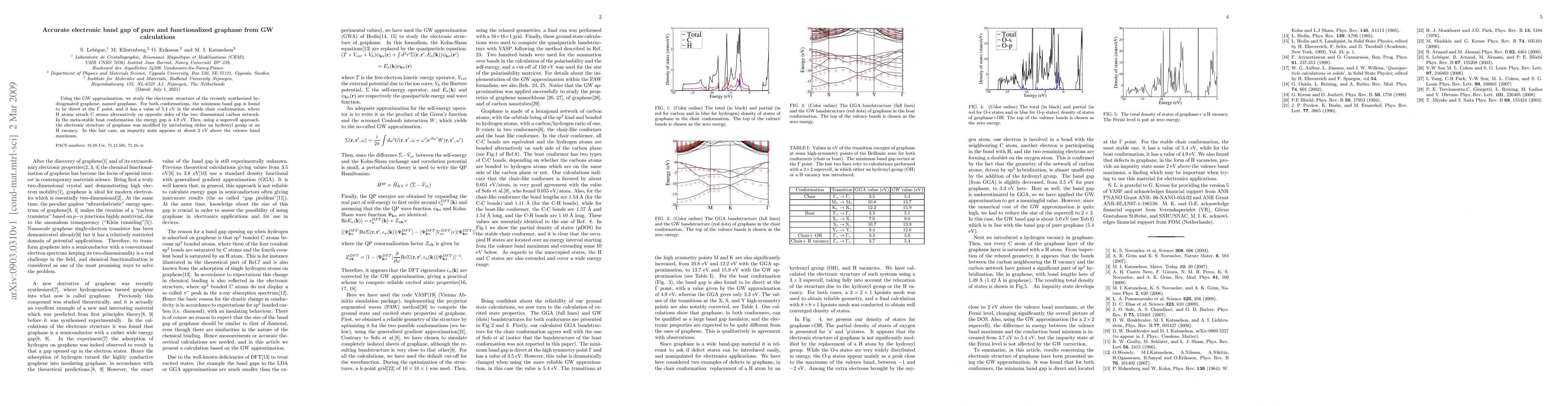Using the GW approximation, we study the electronic structure of the recently synthesized hydrogenated graphene, named graphane. For both conformations, the minimum band gap is found to be direct at the $\Gamma$ point, and it has a value of 5.4 eV in the stable chair conformation, where H atoms attach C atoms alternatively on opposite sides of the two dimensional carbon network. In the meta-stable boat conformation the energy gap is 4.9 eV. Then, using a supercell approach, the electronic structure of graphane was modified by introducing either an hydroxyl group or an H vacancy. In this last case, an impurity state appears at about 2 eV above the valence band maximum.