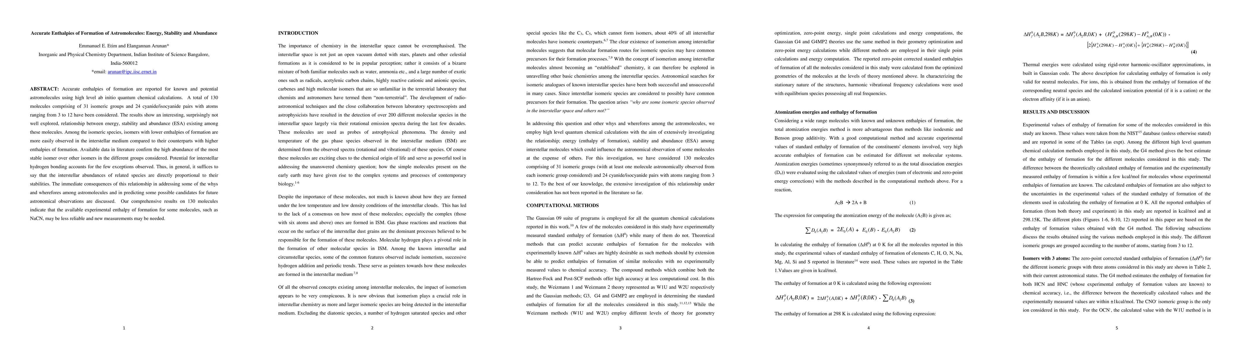 Accurate enthalpies of formation are reported for known and potential astromolecules using high level ab initio quantum chemical calculations. A total of 130 molecules comprising of 31 isomeric groups and 24 cyanide/isocyanide pairs with atoms ranging from 3 to 12 have been considered. The results show an interesting, surprisingly not well explored, relationship between energy, stability and abundance (ESA) existing among these molecules. Among the isomeric species, isomers with lower enthalpies of formation are more easily observed in the interstellar medium compared to their counterparts with higher enthalpies of formation. Available data in literature confirm the high abundance of the most stable isomer over other isomers in the different groups considered. Potential for interstellar hydrogen bonding accounts for the few exceptions observed. Thus, in general, it suffices to say that the interstellar abundances of related species are directly proportional to their stabilities. The immediate consequences of this relationship in addressing some of the whys and wherefores among astromolecules and in predicting some possible candidates for future astronomical observations are discussed. Our comprehensive results on 130 molecules indicate that the available experimental enthalpy of formation for some molecules, such as NaCN, may be less reliable and new measurements may be needed.