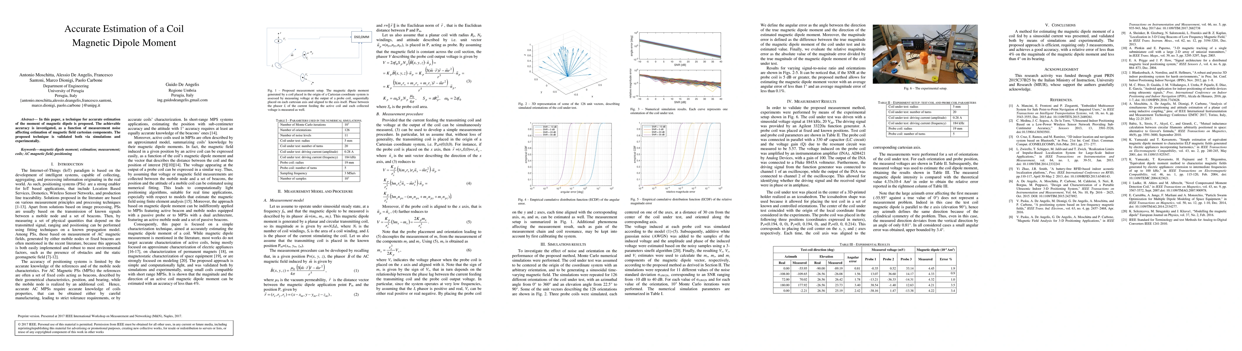 In this paper, a technique for accurate estimation of the moment of magnetic dipole is proposed. The achievable accuracy is investigated, as a function of measurement noise affecting estimation of magnetic field cartesian components. The proposed technique is validated both via simulations and experimentally.