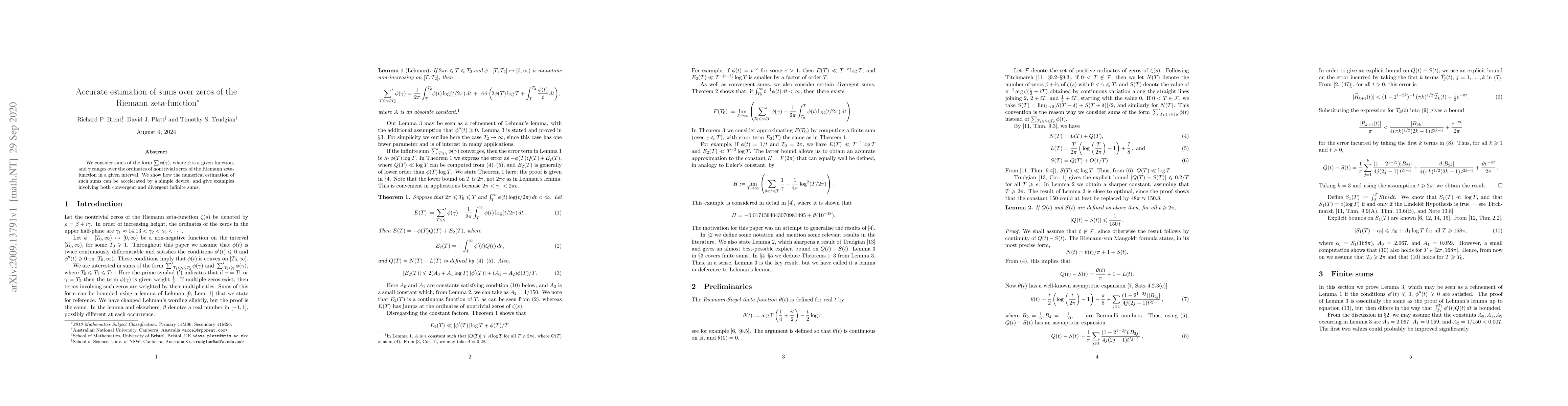 We consider sums of the form $\sum \phi(\gamma)$, where $\phi$ is a given function, and $\gamma$ ranges over the ordinates of nontrivial zeros of the Riemann zeta-function in a given interval. We show how the numerical estimation of such sums can be accelerated by a simple device, and give examples involving both convergent and divergent infinite sums.
