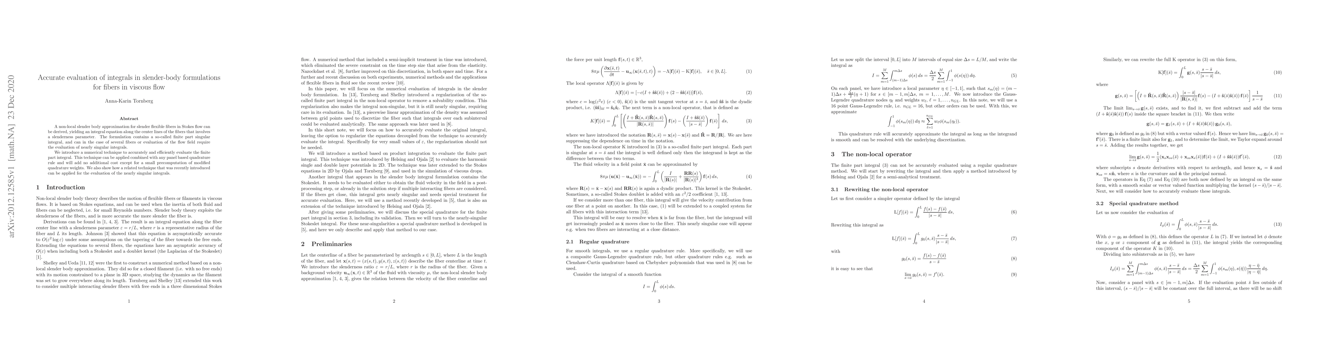 This paper presents a numerical technique for evaluating finite part singular integrals in slender-body formulations for flexible fibers in viscous flow, improving accuracy and efficiency. The method involves a small precomputation adjustment to existing quadrature rules and can also be applied to nearly singular integrals.