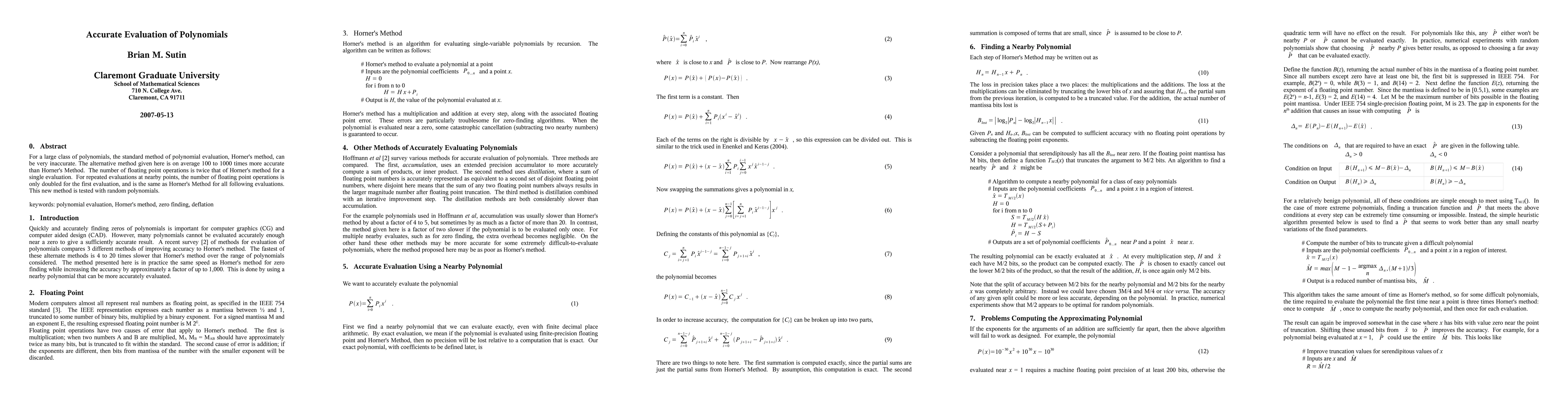 For a large class of polynomials, the standard method of polynomial evaluation, Horner's method, can be very inaccurate. The alternative method given here is on average 100 to 1000 times more accurate than Horner's Method. The number of floating point operations is twice that of Horner's method for a single evaluation. For repeated evaluations at nearby points, the number of floating point operations is only doubled for the first evaluation, and is the same as Horner's Method for all following evaluations. This new method is tested with random polynomials.