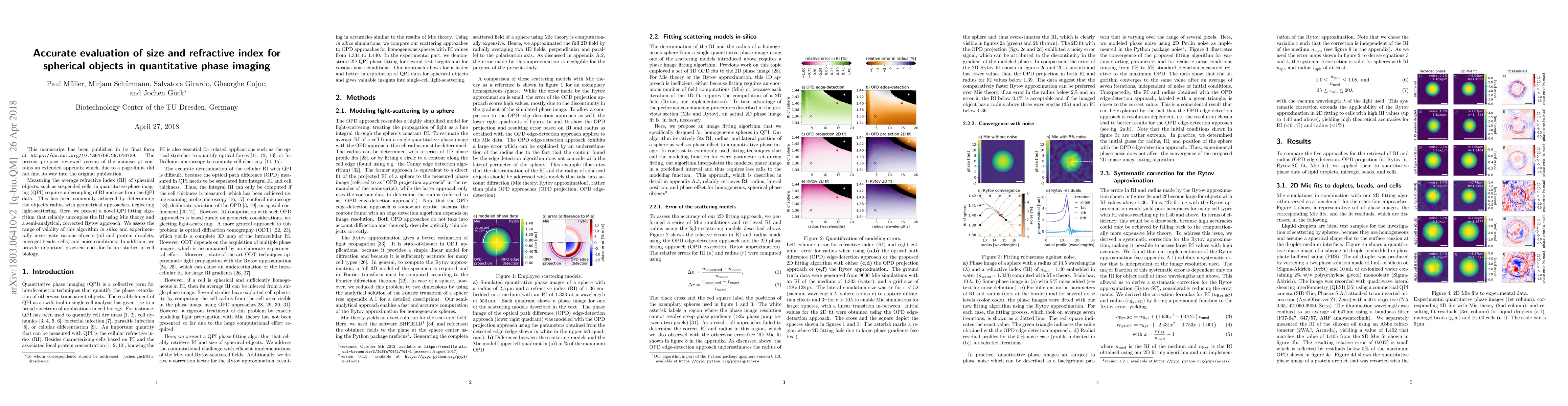 This paper presents a novel quantitative phase imaging (QPI) fitting algorithm that accurately separates refractive index and size for spherical objects using Mie theory and a corrected Rytov approach. The algorithm's effectiveness is validated both in silico and experimentally with various objects and noise conditions, offering practical insights for future cell biology studies.