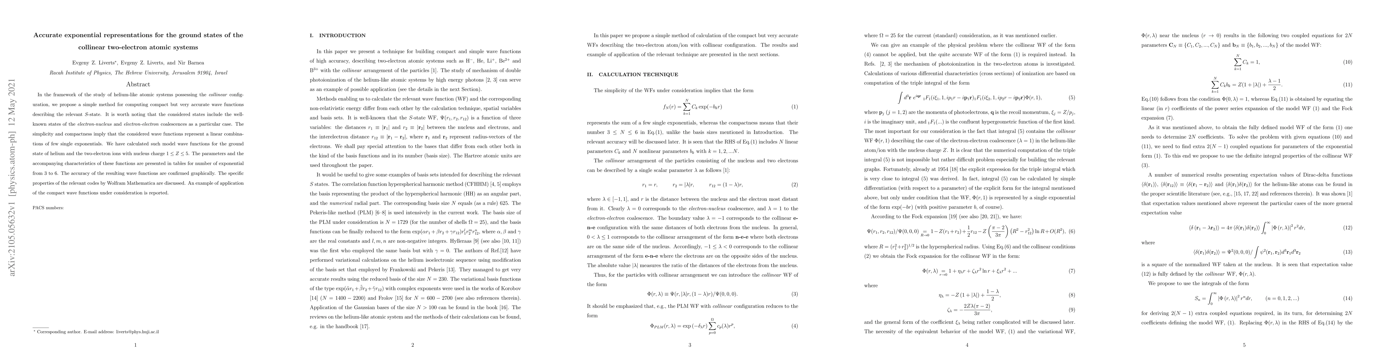 This paper proposes a simple method for computing accurate exponential representations of the ground states in collinear two-electron atomic systems, including helium and ions with nuclear charge up to 5. The resulting compact wave functions are linear combinations of few single exponentials, validated through graphical accuracy confirmation.
