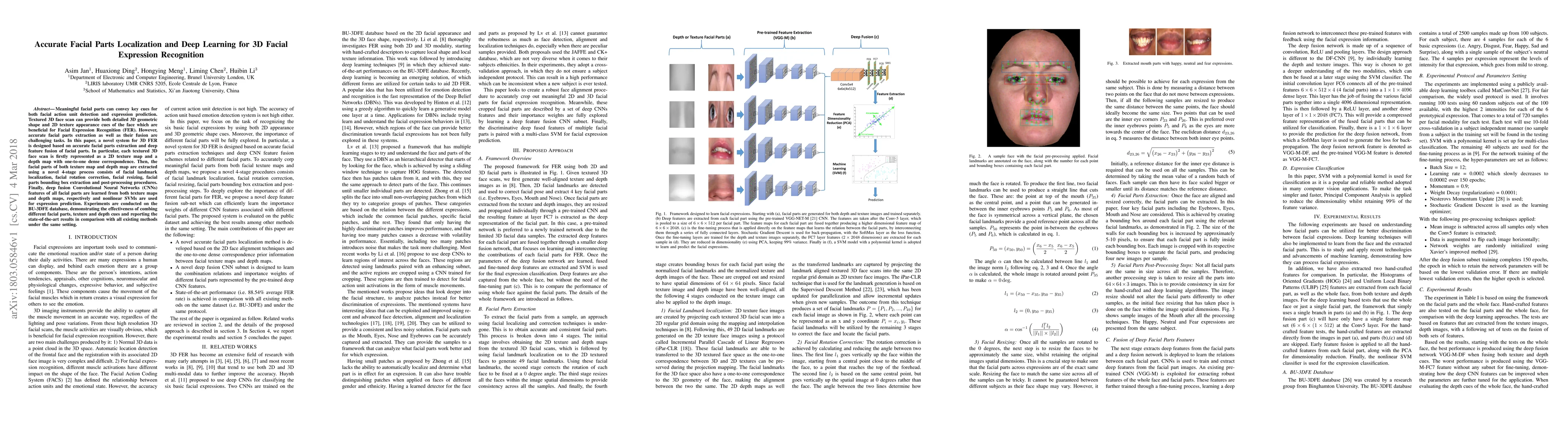 This paper proposes a novel system for 3D Facial Expression Recognition (FER) that accurately extracts facial parts from textured 3D face scans and fuses their deep features for expression prediction, achieving state-of-the-art results on the BU-3DFE database. The method involves a 4-stage process for facial parts extraction and deep fusion of CNN features from texture and depth maps.