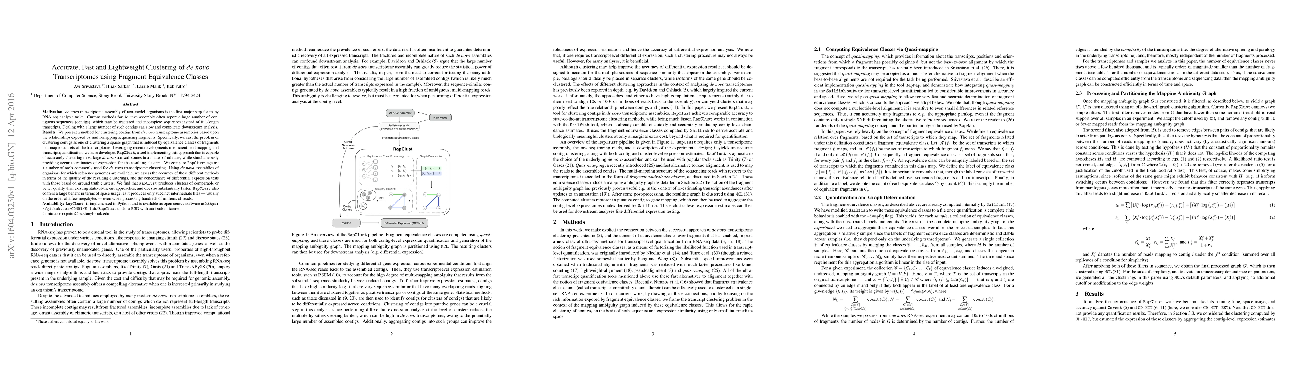 This paper introduces RapClust, a fast and lightweight method for clustering de novo transcriptome assemblies based on fragment equivalence classes, achieving accurate clustering in minutes compared to existing methods, while significantly reducing computational space requirements. RapClust outperforms other tools in terms of both clustering quality and speed.