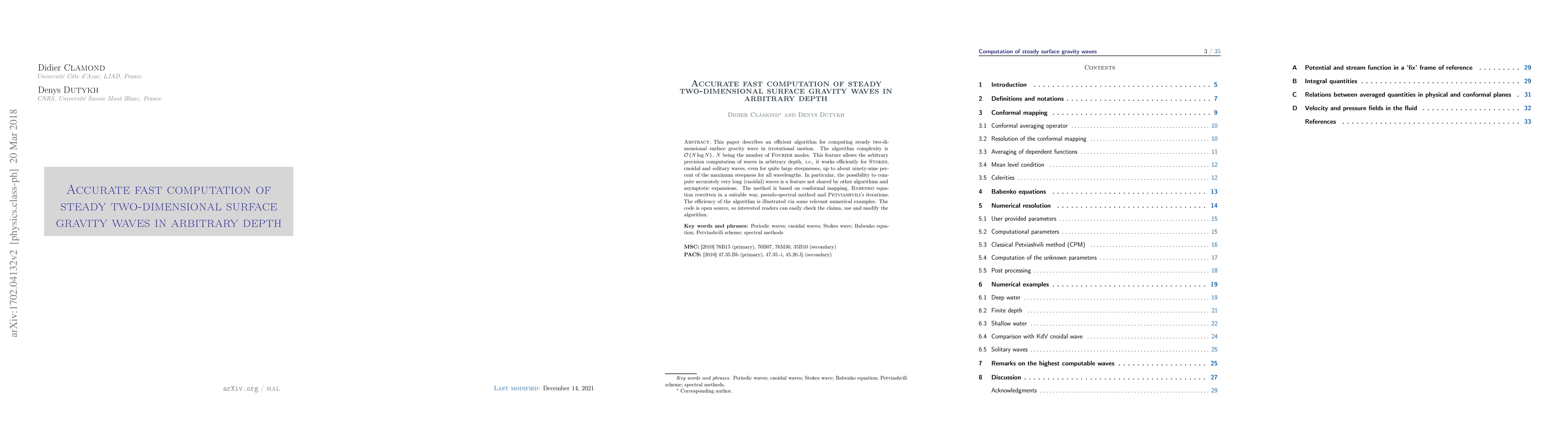 This paper describes an efficient algorithm for computing steady two-dimensional surface gravity wave in irrotational motion. The algorithm complexity is O(N log N), N being the number of Fourier modes. The algorithm allows the arbitrary precision computation of waves in arbitrary depth, i.e., it works efficiently for Stokes, cnoidal and solitary waves, even for quite large steepnesses. The method is based on conformal mapping, Babenko equation rewritten in a suitable way, pseudo-spectral method and Petviashvili's iterations. The efficiency of the algorithm is illustrated via some relevant numerical examples. The code is open source, so interested readers can easily check the claims, use and modify the algorithm.
