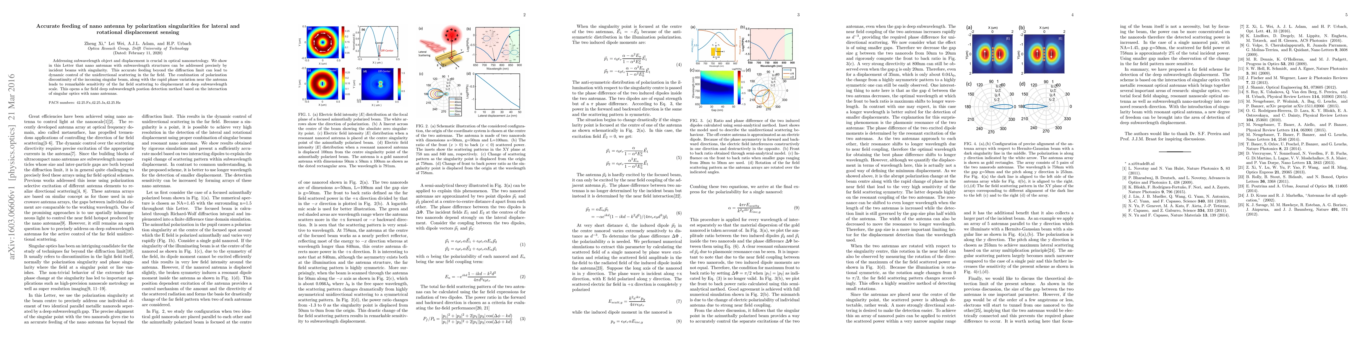 This paper demonstrates that nano antennas can be precisely fed by beams with polarization singularities, enabling accurate sensing of lateral and rotational displacement at subwavelength scales. The interaction of singular optics with nano antennas provides a method for deep subwavelength position detection through dynamic control of unidirectional scattering.