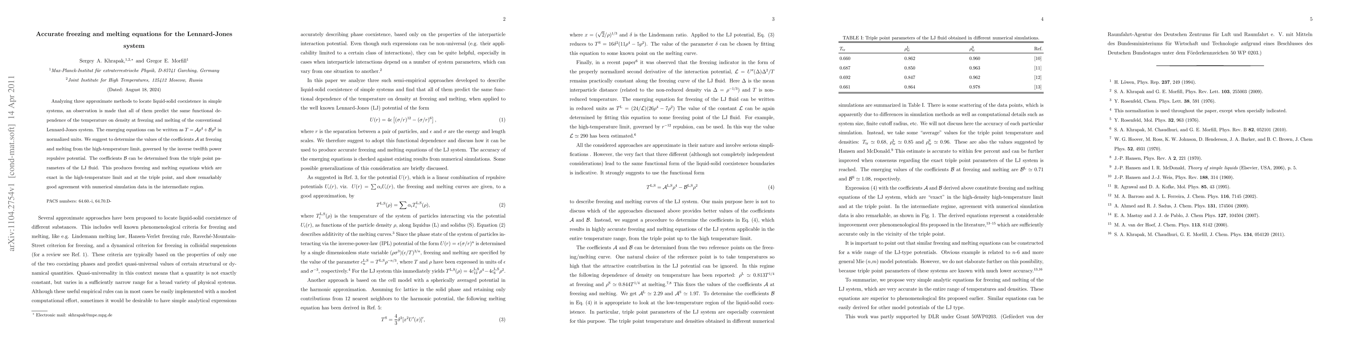 The paper presents analytical freezing and melting equations for the Lennard-Jones system, derived from semi-empirical approaches and validated against numerical simulation data.