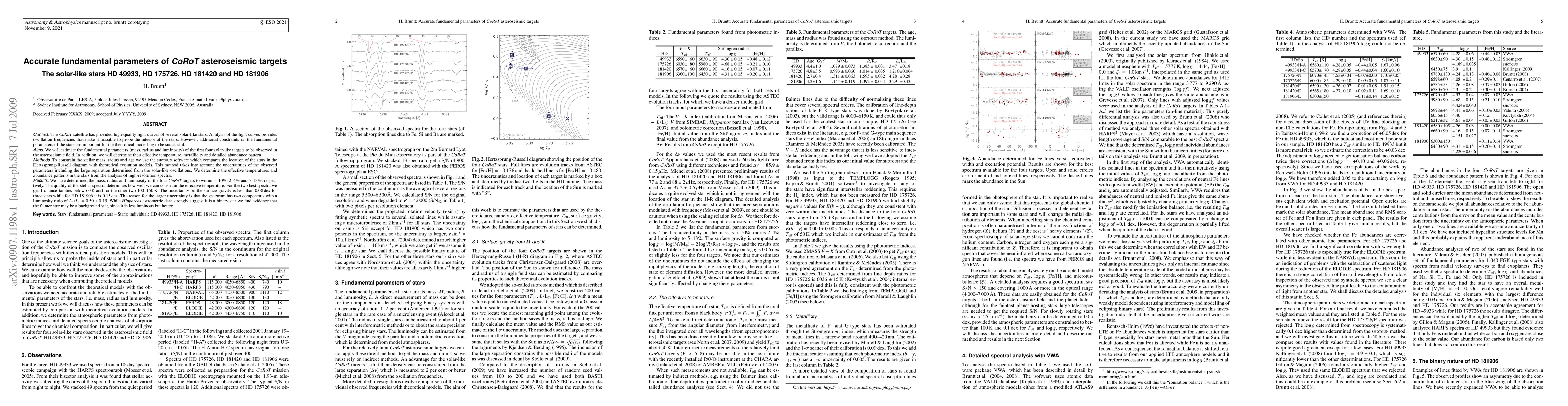 The CoRoT satellite has provided high-quality light curves of several solar-like stars. Analysis of the light curves provides oscillation frequencies that make it possible to probe the interior of the stars. However, additional constraints on the fundamental parameters of the stars are important for the theoretical modelling to be successful. We will estimate the fundamental parameters (mass, radius and luminosity) of the first four solar-like targets to be observed in the asteroseismic field. In addition, we will determine their effective temperature, metallicity and detailed abundance pattern. To constrain the stellar mass, radius and age we use the SHOTGUN software which compares the location of the stars in the Hertzsprung-Russell diagram with theoretical evolution models. This method takes into account the uncertainties of the observed parameters including the large separation determined from the solar-like oscillations. We determine the effective temperatures and abundance patterns in the stars from the analysis of high-resolution spectra. We have determined the mass, radius and luminosity of the four CoRoT targets to within 5-10 percent, 2-4 percent and 5-13 percent, respectively. The quality of the stellar spectra determines how well we can constrain the effective temperature. For the two best spectra we get 1-sigma uncertainties below 60 K and for the other two 100-150 K. The uncertainty on the surface gravity is less than 0.08 dex for three stars while for HD 181906 it is 0.15 dex. The reason for the larger uncertainty is that the spectrum has two components with a luminosity ratio of Lp/Ls = 0.50+-0.15. While Hipparcos astrometric data strongly suggest it is a binary star we find evidence that the fainter star may be a background star, since it is less luminous but hotter.