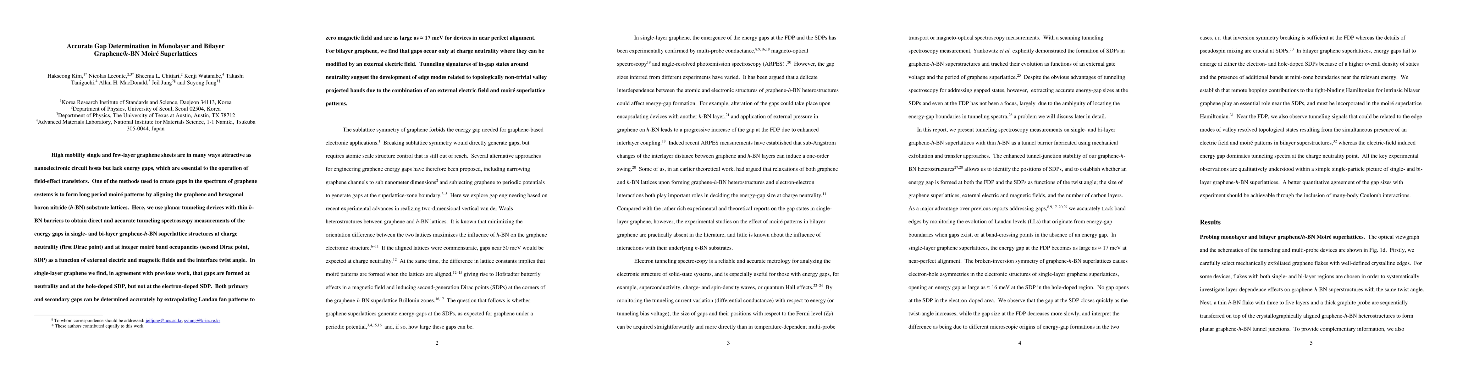 This paper investigates the energy gaps in graphene/h-BN moire superlattices, revealing the formation of gaps at specific charge neutrality points and under external fields. Accurate tunneling spectroscopy measurements show that single-layer graphene forms gaps at neutrality and hole-doped states, while bilayer graphene gaps only occur at neutrality and can be tuned by electric fields.
