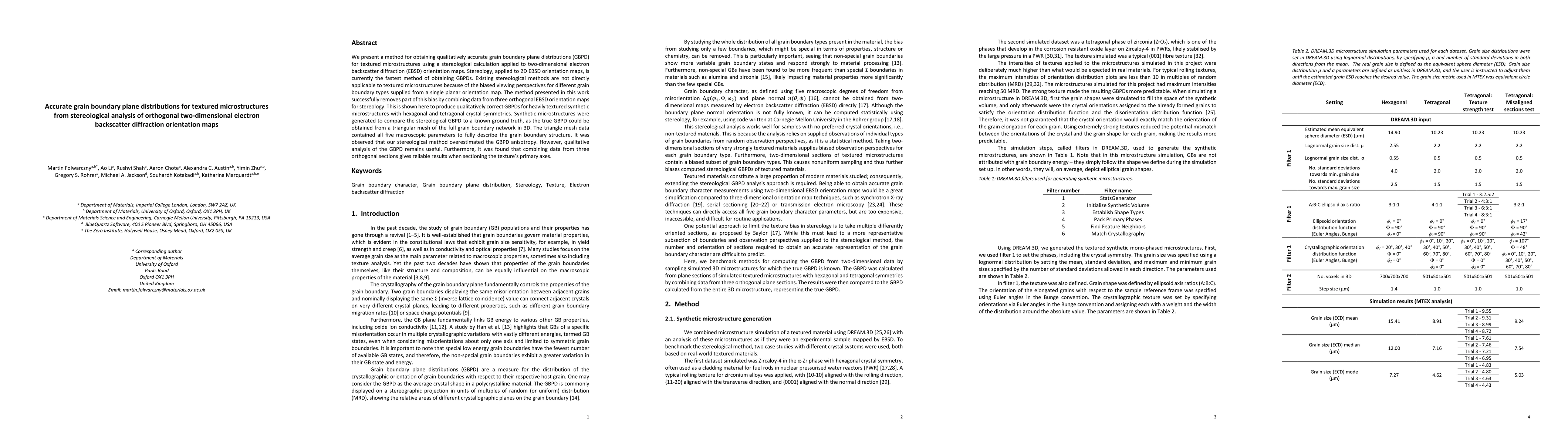 The research presents a method utilizing stereological calculations on three orthogonal 2D electron backscatter diffraction (EBSD) orientation maps to obtain grain boundary plane distributions (GBPD) for textured microstructures, addressing biases from single planar orientation maps.