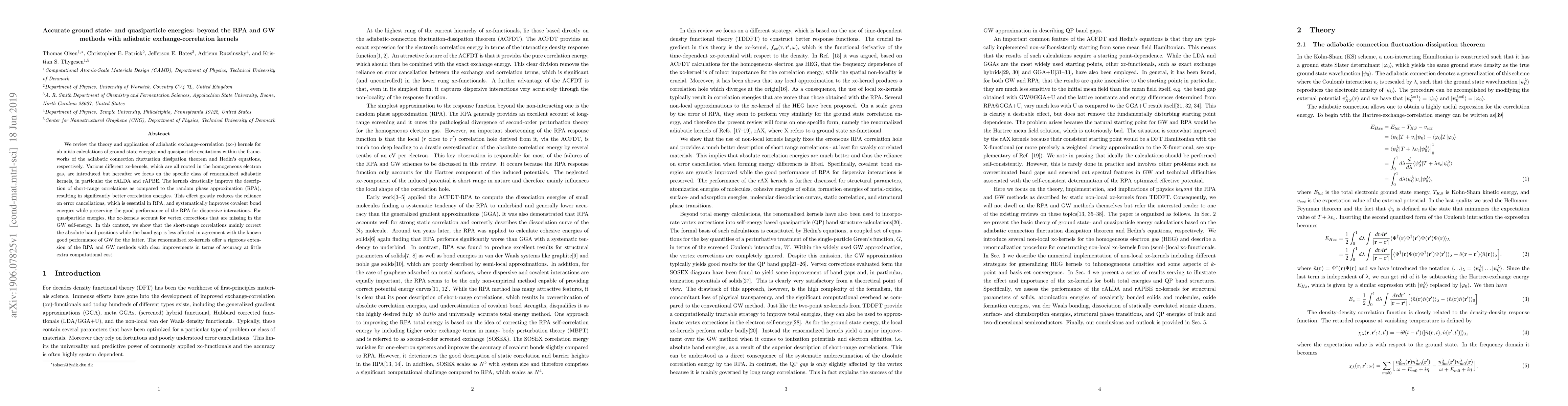 This paper reviews the use of adiabatic exchange-correlation kernels to enhance the accuracy of ground state and quasiparticle energies beyond traditional RPA and GW methods. The renormalized adiabatic kernels, such as rALDA and rAPBE, significantly improve short-range correlation descriptions and covalent bond energies while maintaining GW's effectiveness for dispersive interactions and band gaps.