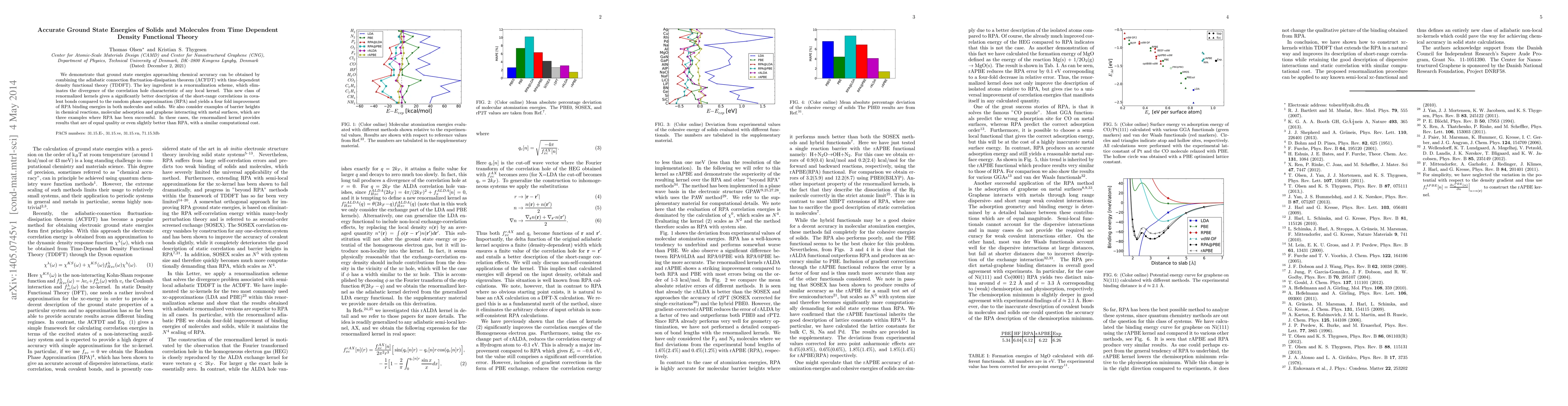 This paper presents a method combining the adiabatic connection fluctuation-dissipation theorem with time-dependent density functional theory to achieve chemical accuracy in ground state energies. The proposed renormalization scheme significantly improves the description of short-range correlations in covalent bonds, offering a four-fold improvement over the random phase approximation in binding energies.