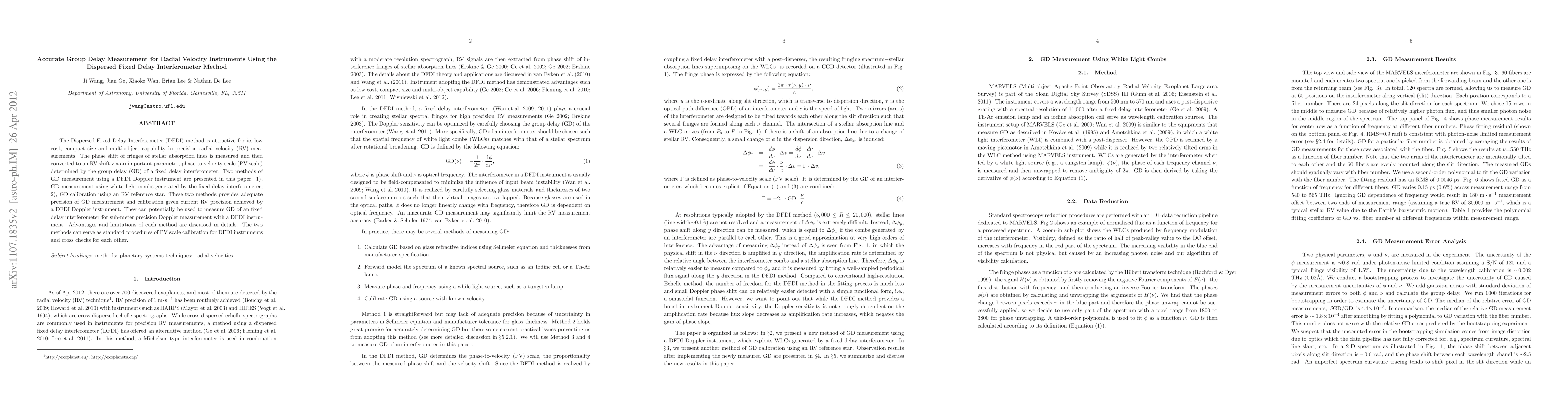 The paper introduces and discusses two methods for GD measurement and calibration in DFDI instruments, providing a detailed analysis of their advantages, limitations, and potential for high-precision RV measurements.