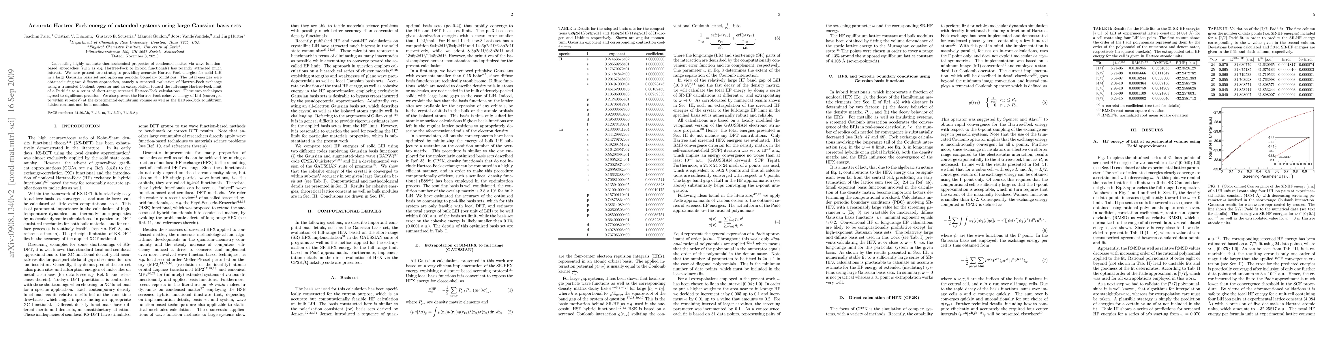 This paper presents two strategies for accurately calculating Hartree-Fock energies in extended systems using large Gaussian basis sets, demonstrating precise results for solid LiH. The methods involve supercell evaluation and extrapolation via Padé fits, yielding cohesive energy, lattice constant, and bulk modulus with high precision.