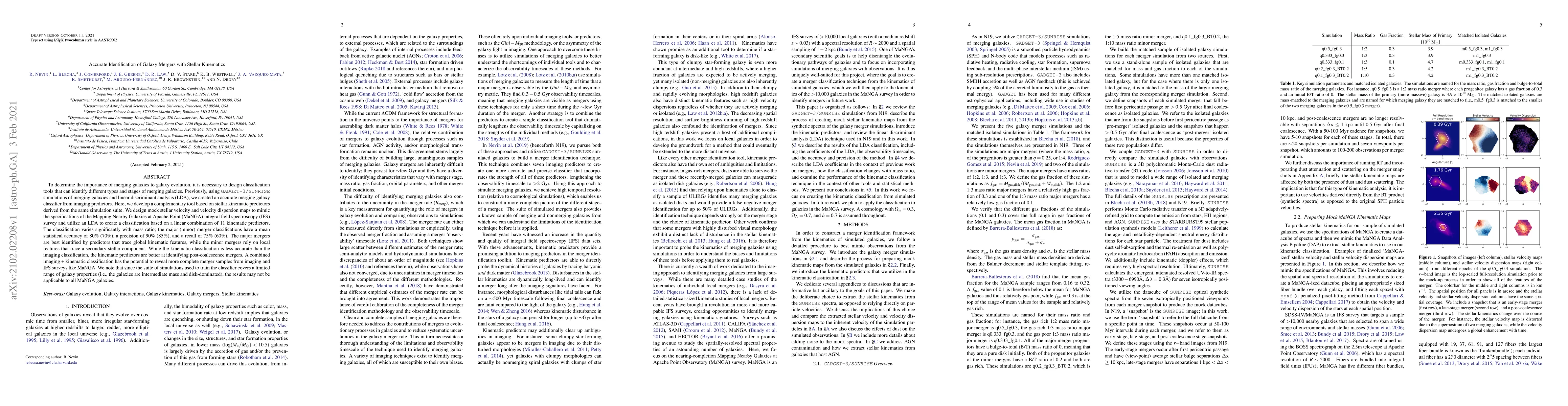 To determine the importance of merging galaxies to galaxy evolution, it is necessary to design classification tools that can identify different types and stages of merging galaxies. Previously, using GADGET-3/SUNRISE simulations of merging galaxies and linear discriminant analysis (LDA), we created an accurate merging galaxy classifier from imaging predictors. Here, we develop a complementary tool based on stellar kinematic predictors derived from the same simulation suite. We design mock stellar velocity and velocity dispersion maps to mimic the specifications of the Mapping Nearby Galaxies at Apache Point (MaNGA) integral field spectroscopy (IFS) survey and utilize an LDA to create a classification based on a linear combination of 11 kinematic predictors. The classification varies significantly with mass ratio; the major (minor) merger classifications have a mean statistical accuracy of 80% (70%), a precision of 90% (85%), and a recall of 75% (60%). The major mergers are best identified by predictors that trace global kinematic features, while the minor mergers rely on local features that trace a secondary stellar component. While the kinematic classification is less accurate than the imaging classification, the kinematic predictors are better at identifying post-coalescence mergers. A combined imaging + kinematic classification has the potential to reveal more complete merger samples from imaging and IFS surveys like MaNGA. We note that since the suite of simulations used to train the classifier covers a limited range of galaxy properties (i.e., the galaxies are intermediate mass and disk-dominated), the results may not be applicable to all MaNGA galaxies.