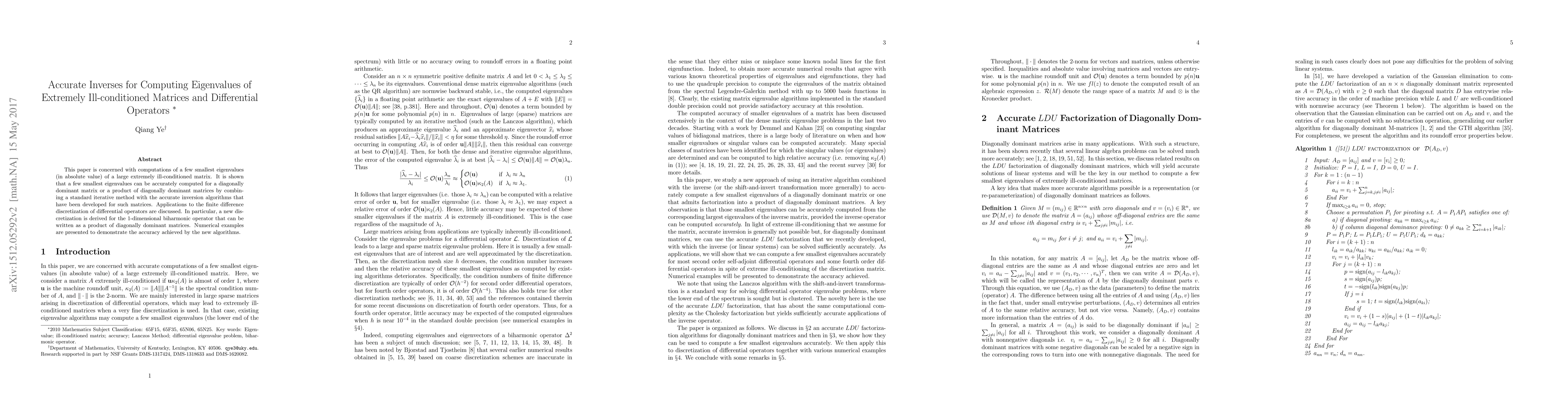 This paper is concerned with computations of a few smaller eigenvalues (in absolute value) of a large extremely ill-conditioned matrix. It is shown that smaller eigenvalues can be accurately computed for a diagonally dominant matrix or a product of diagonally dominant matrices by combining a standard iterative method with the accurate inversion algorithms that have been developed for such matrices. Applications to the finite difference discretization of differential operators are discussed. In particular, a new discretization is derived for the 1-dimensional biharmonic operator that can be written as a product of diagonally dominant matrices. Numerical examples are presented to demonstrate the accuracy achieved by the new algorithms.