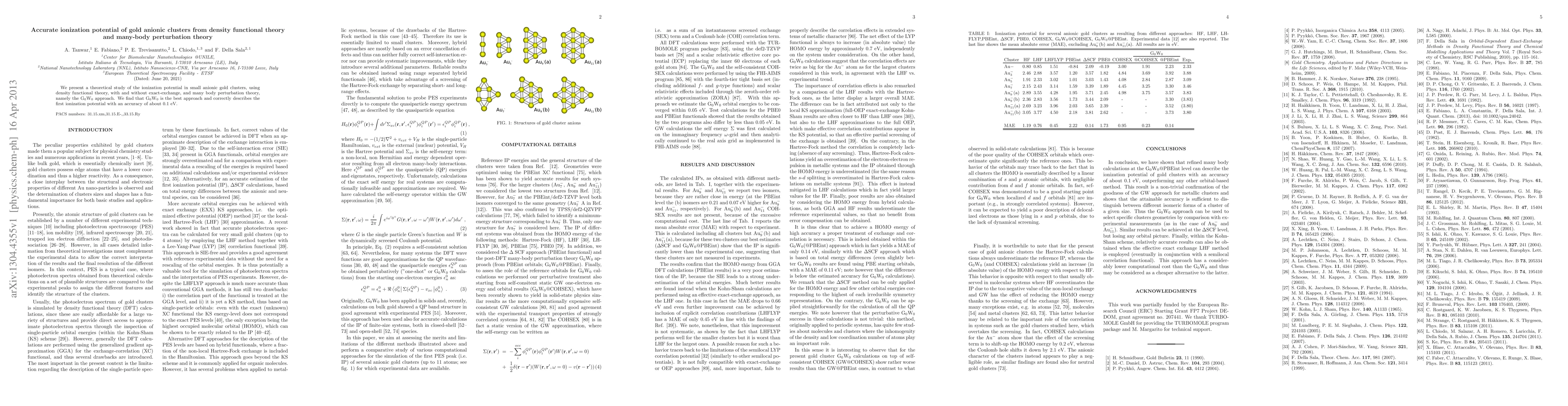 This study compares ionization potentials in small anionic gold clusters using density functional theory and many-body perturbation theory (G0W0). The G0W0 approach is found to provide the most accurate first ionization potential, with an error margin of approximately 0.1 eV.