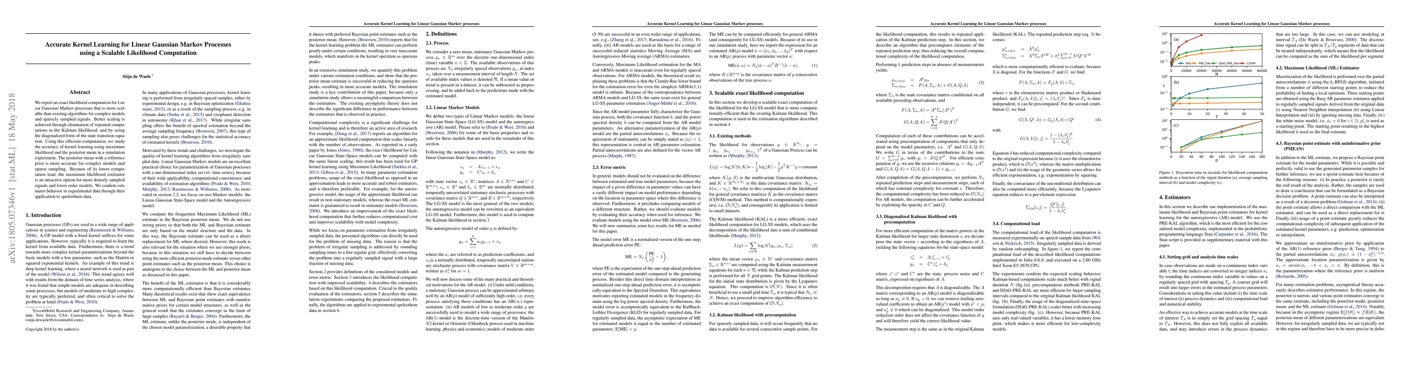 We report an exact likelihood computation for Linear Gaussian Markov processes that is more scalable than existing algorithms for complex models and sparsely sampled signals. Better scaling is achieved through elimination of repeated computations in the Kalman likelihood, and by using the diagonalized form of the state transition equation. Using this efficient computation, we study the accuracy of kernel learning using maximum likelihood and the posterior mean in a simulation experiment. The posterior mean with a reference prior is more accurate for complex models and sparse sampling. Because of its lower computation load, the maximum likelihood estimator is an attractive option for more densely sampled signals and lower order models. We confirm estimator behavior in experimental data through their application to speleothem data.