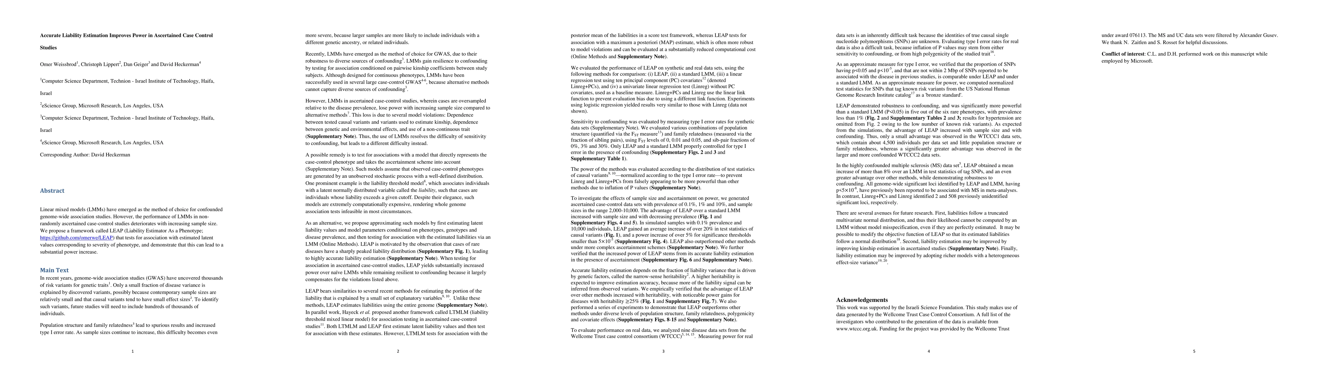 This paper proposes LEAP, a framework that uses liability estimation to improve the power of genome-wide association studies in non-randomly ascertained case-control samples. LEAP tests for association with latent phenotype severity values, demonstrating significant power gains compared to traditional linear mixed models.