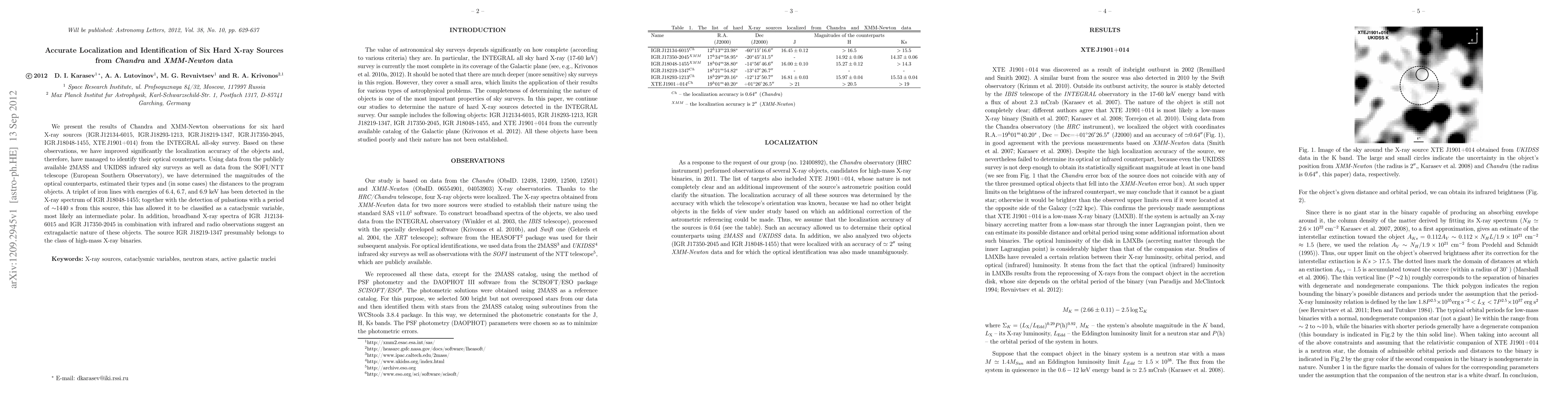 This study improves localization accuracy of six hard X-ray sources, identifying their optical counterparts through Chandra and XMM-Newton data, and classifying some as cataclysmic variables or high-mass binaries.