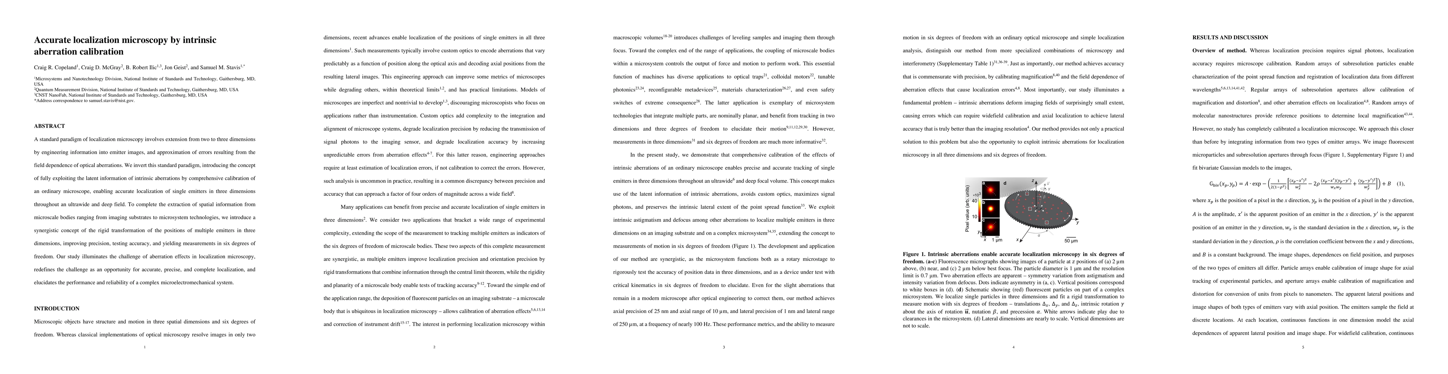A standard paradigm of localization microscopy involves extension from two to three dimensions by engineering information into emitter images, and approximation of errors resulting from the field dependence of optical aberrations. We invert this standard paradigm, introducing the concept of fully exploiting the latent information of intrinsic aberrations by comprehensive calibration of an ordinary microscope, enabling accurate localization of single emitters in three dimensions throughout an ultrawide and deep field. To complete the extraction of spatial information from microscale bodies ranging from imaging substrates to microsystem technologies, we introduce a synergistic concept of the rigid transformation of the positions of multiple emitters in three dimensions, improving precision, testing accuracy, and yielding measurements in six degrees of freedom. Our study illuminates the challenge of aberration effects in localization microscopy, redefines the challenge as an opportunity for accurate, precise, and complete localization, and elucidates the performance and reliability of a complex microelectromechanical system.