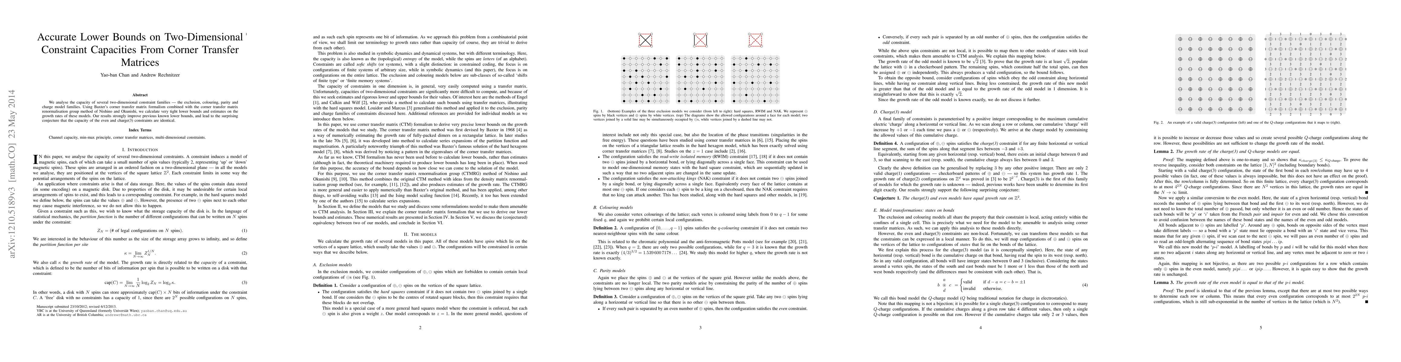 We analyse the capacity of several two-dimensional constraint families - the exclusion, colouring, parity and charge model families. Using Baxter's corner transfer matrix formalism combined with the corner transfer matrix renormalisation group method of Nishino and Okunishi, we calculate very tight lower bounds and estimates on the growth rate of these models. Our results strongly improve previous known lower bounds, and lead to the surprising conjecture that the capacity of the even and charge(3) constraints are identical.
