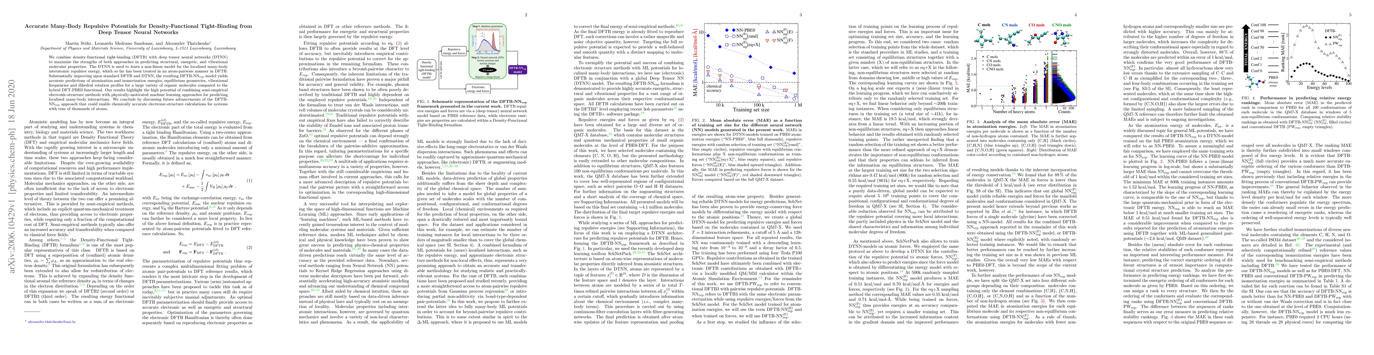 This paper combines density-functional tight-binding (DFTB) with deep tensor neural networks (DTNN) to predict molecular properties more accurately. The DTNN model enhances DFTB by learning localized many-body interatomic repulsive energies, resulting in improved predictions of molecular energies, geometries, and vibrational frequencies.