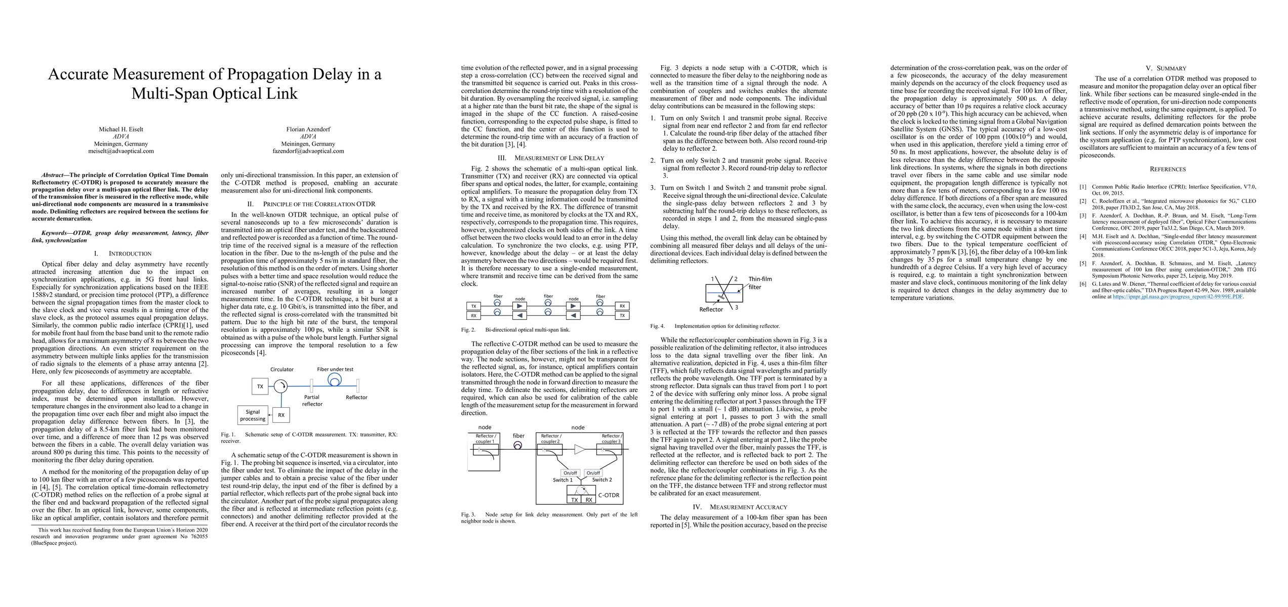 This paper proposes using Correlation Optical Time Domain Reflectometry (C-OTDR) to accurately measure propagation delay in a multi-span optical fiber link, with reflective mode for transmission fibers and transmissive mode for uni-directional node components, employing delimiting reflectors for precise section demarcation.