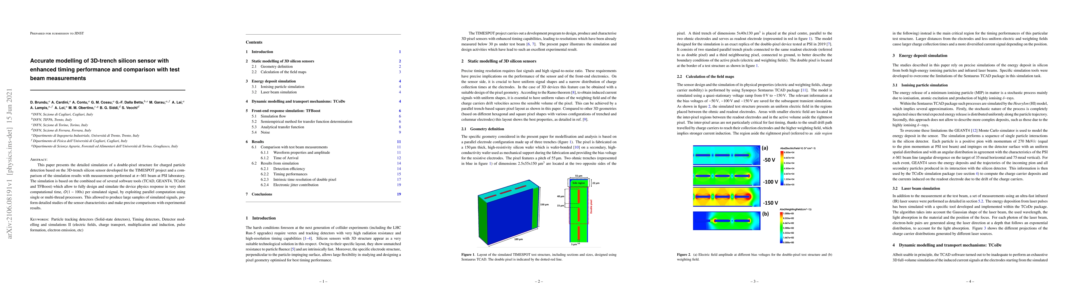 This paper simulates a double-pixel 3D-trench silicon sensor for charged particle detection using advanced software tools, and compares the results with test beam measurements at PSI laboratory, achieving enhanced timing performance. The simulation methodology allows for rapid and detailed analysis of sensor characteristics.